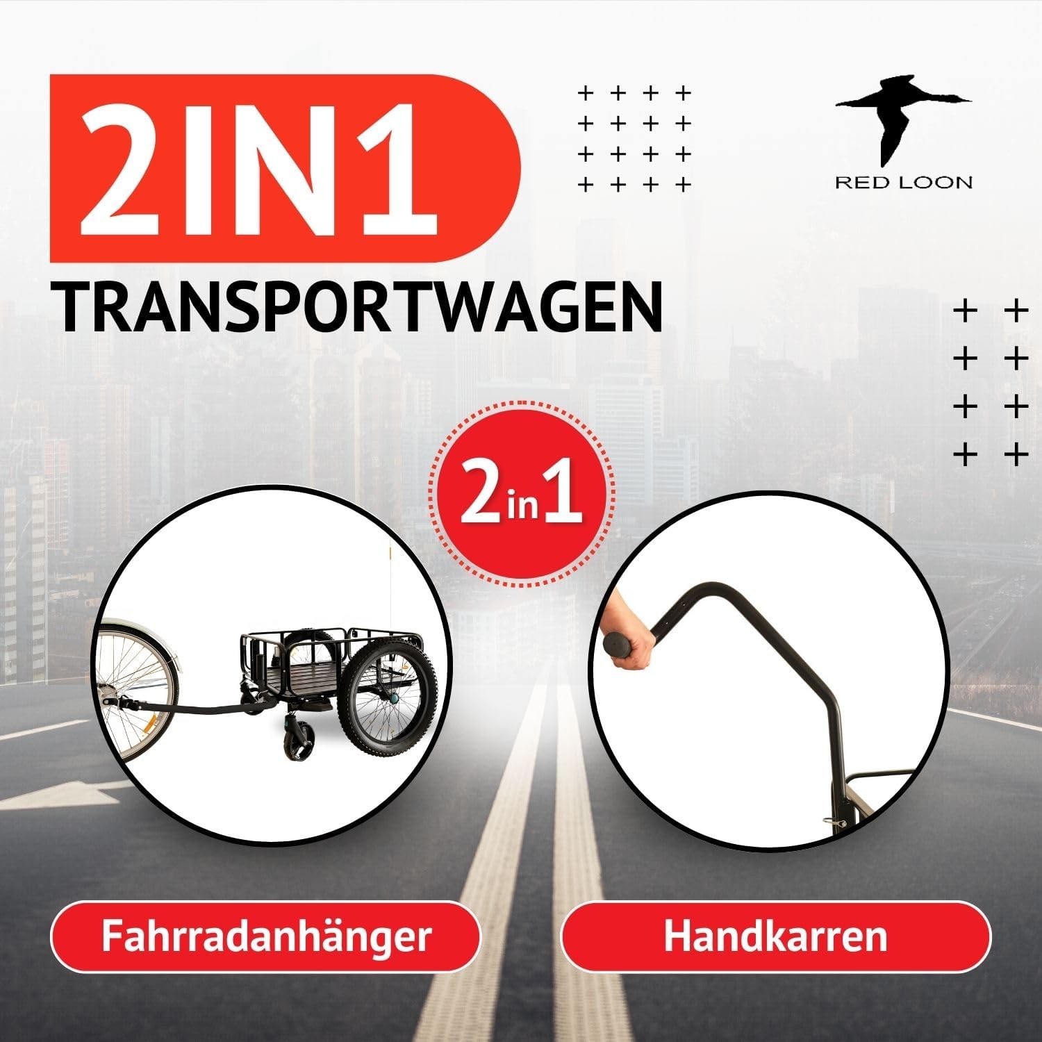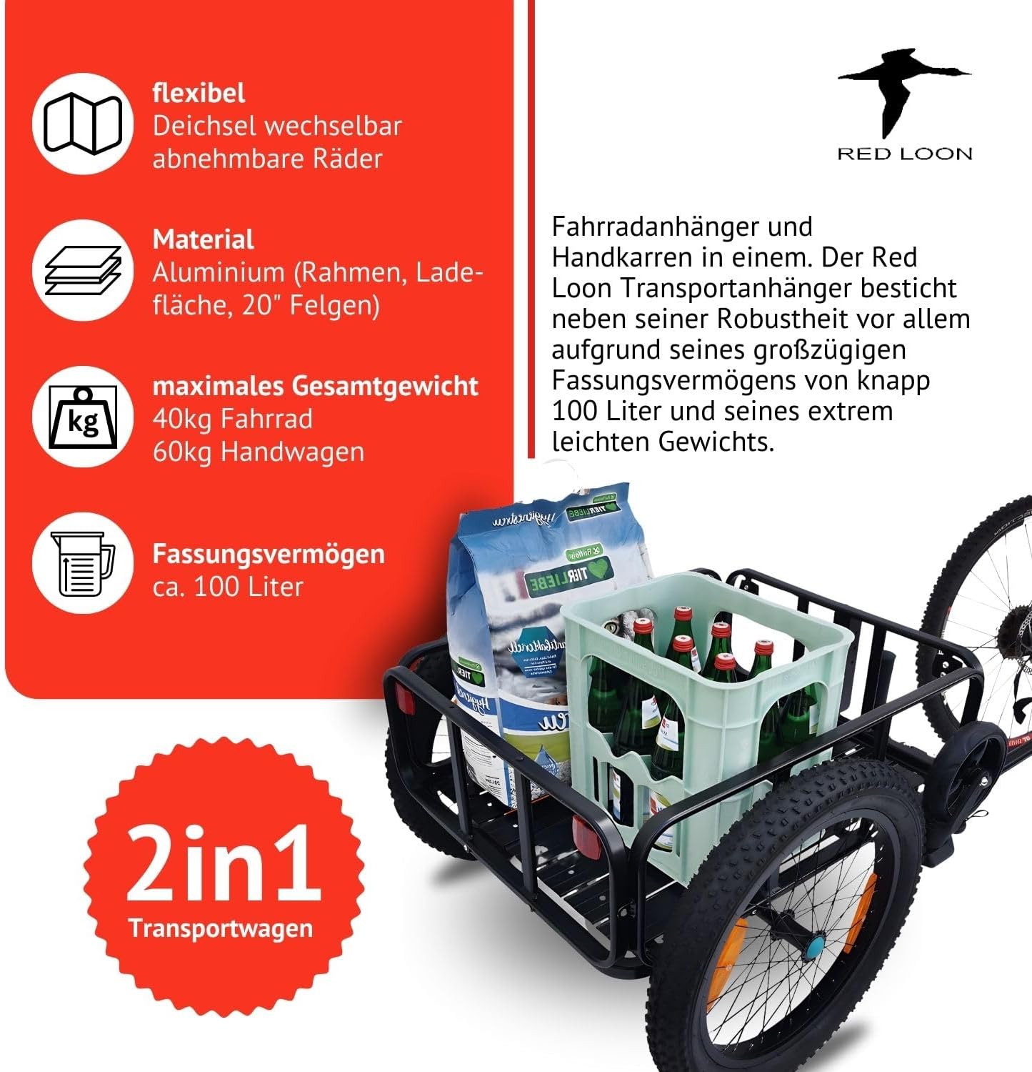 Jetzt entdecken: 2-in-1 Bicycle Trailer Load Trailer Hand Trolley – Red Loon Aluminium Transport Trailer BAC502-100 Litres – Extra Wide 20 Inch Pneumatic Tyres – Max. 60 kg – Trailer for 26-28 Inch Bicycles – Handcart