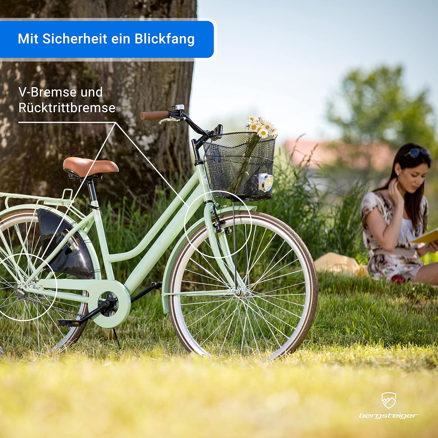Mit dem Bergsteiger Amsterdam 26-Inch/28-Inch Women’s Bicycle, from 150 cm, Basket, Bicycle Light, City Bike with Back Pedal Brake, Dutch-Style Bicycle in a Retro Design bekommst du Qualität, Komfort und Stil – perfekt für deine nächste Tour.