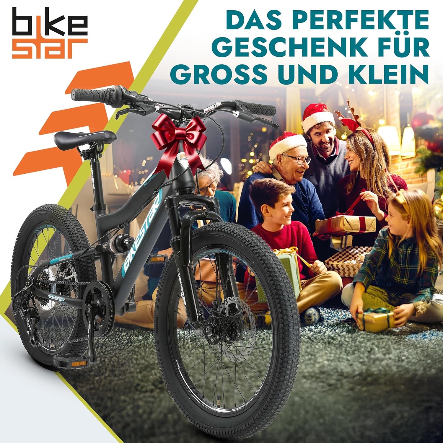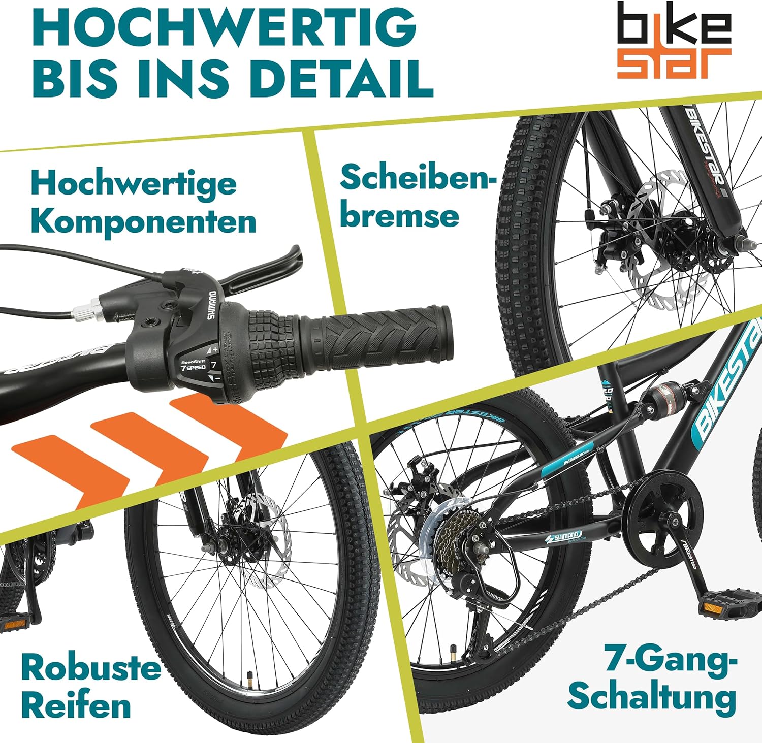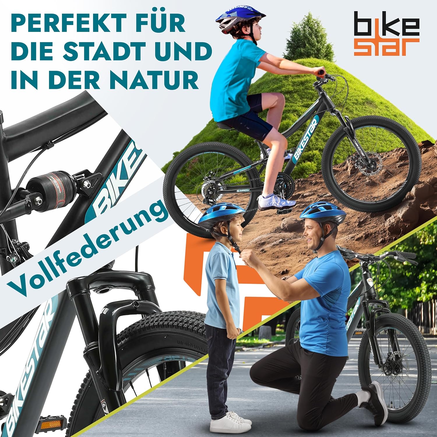 Mit dem BIKESTAR Children’s Bicycle Fully Mountain Bike 7 Speed Shimano, Disc Brake from 6 Years