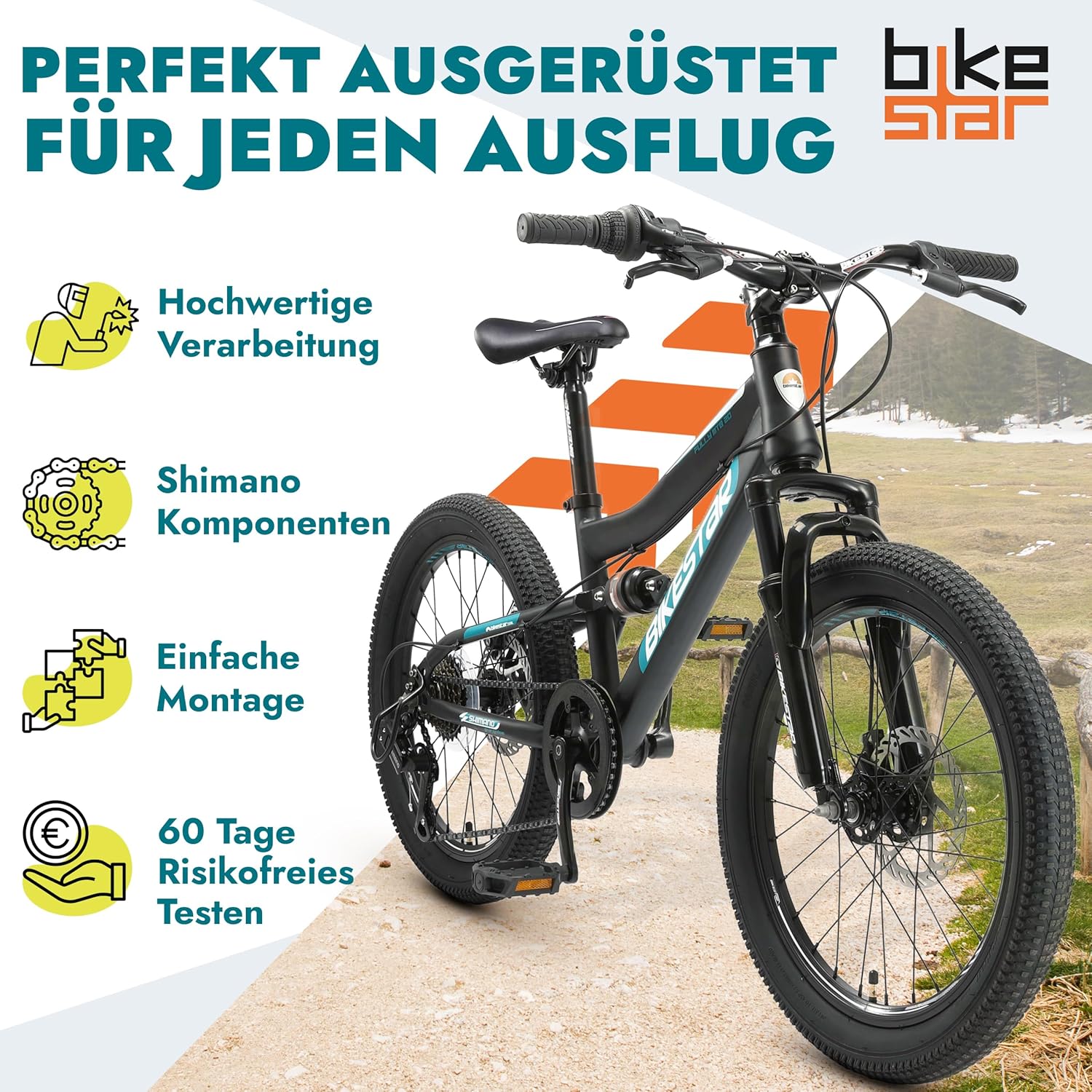 Top-Angebot: BIKESTAR Children’s Bicycle Fully Mountain Bike 7 Speed Shimano, Disc Brake from 6 Years | 20 Inch Children’s Bike MTB | Risk Free Testing