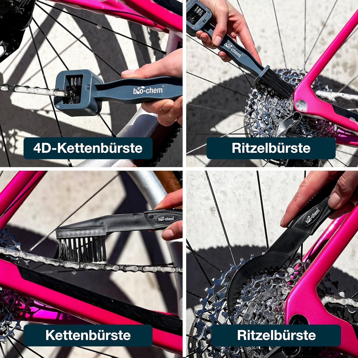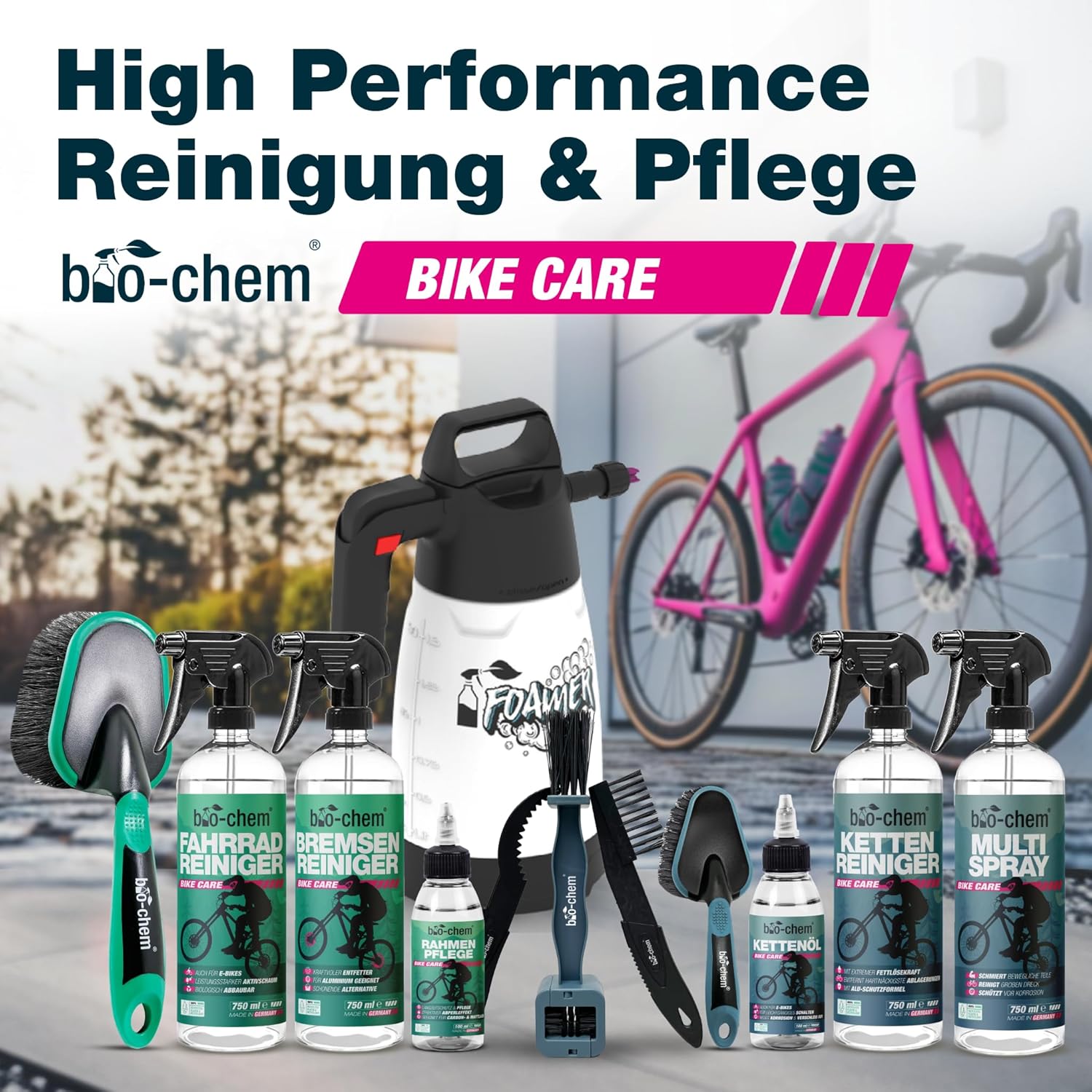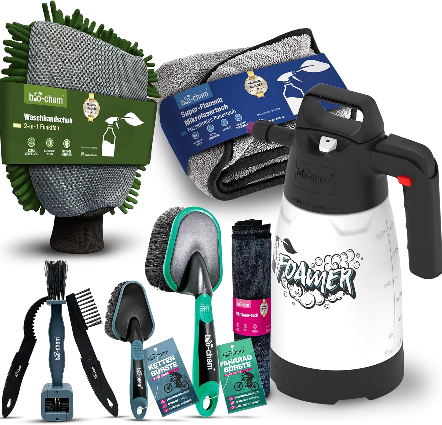 Top-Angebot: bio-chem Bicycle Cleaning Accessories Set 9 Pieces | Foam Sprayer Brush Set for Chain & Frame – Cleaning Brush, Chain Brush, Microfibre Cloth – Bicycle Care Accessories for Road Bike MTB E-Bike