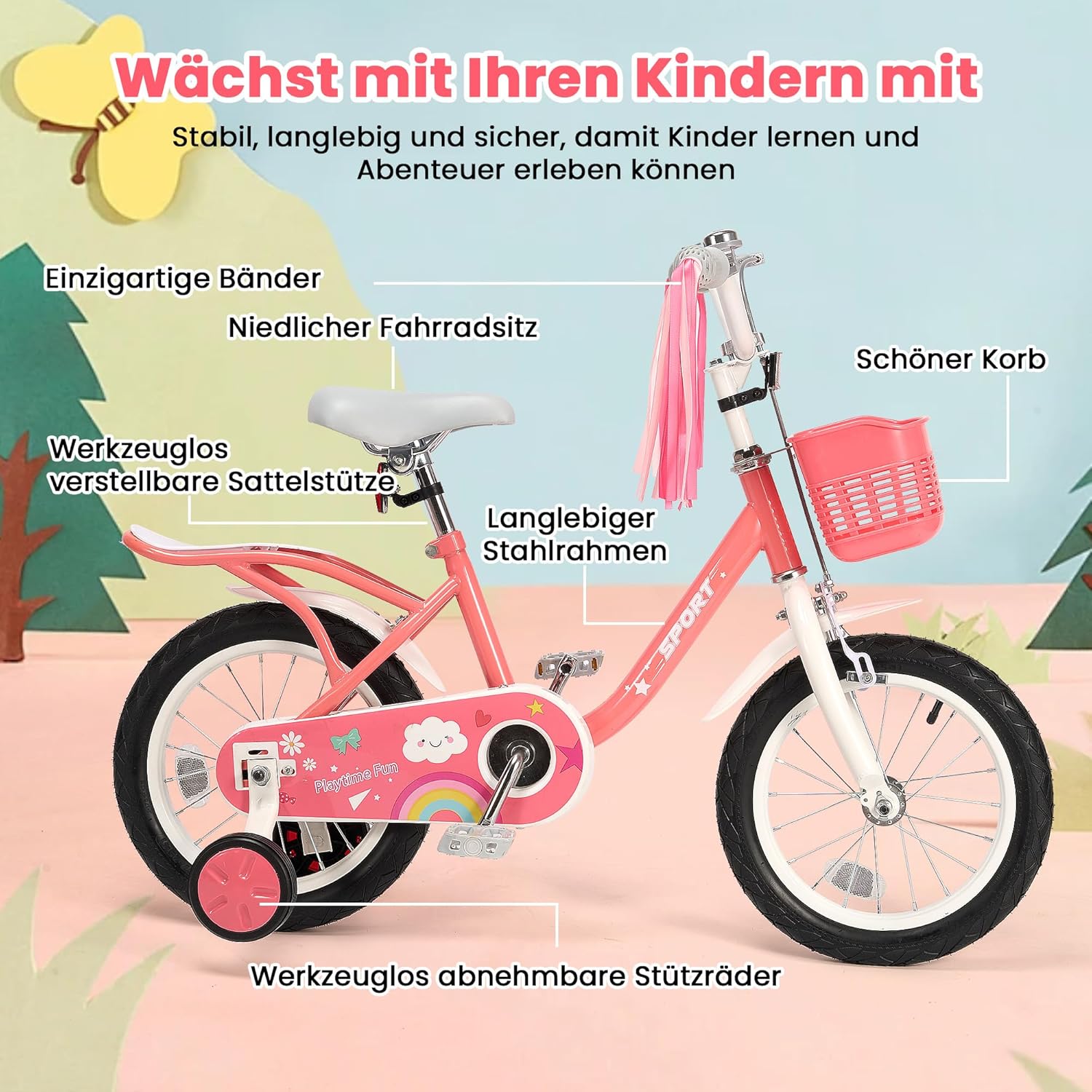 Jetzt entdecken: BODIOO 12 and 14 Zoll Kinderfahrrad Fahrrad für Mädchenmit und Jungen Stützrädern & verstellbarem Sattelfür Spielrad mit Korb & Klingel Fahrer von 94 bis 107 cm-Rosa