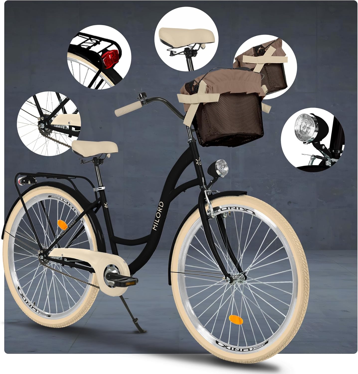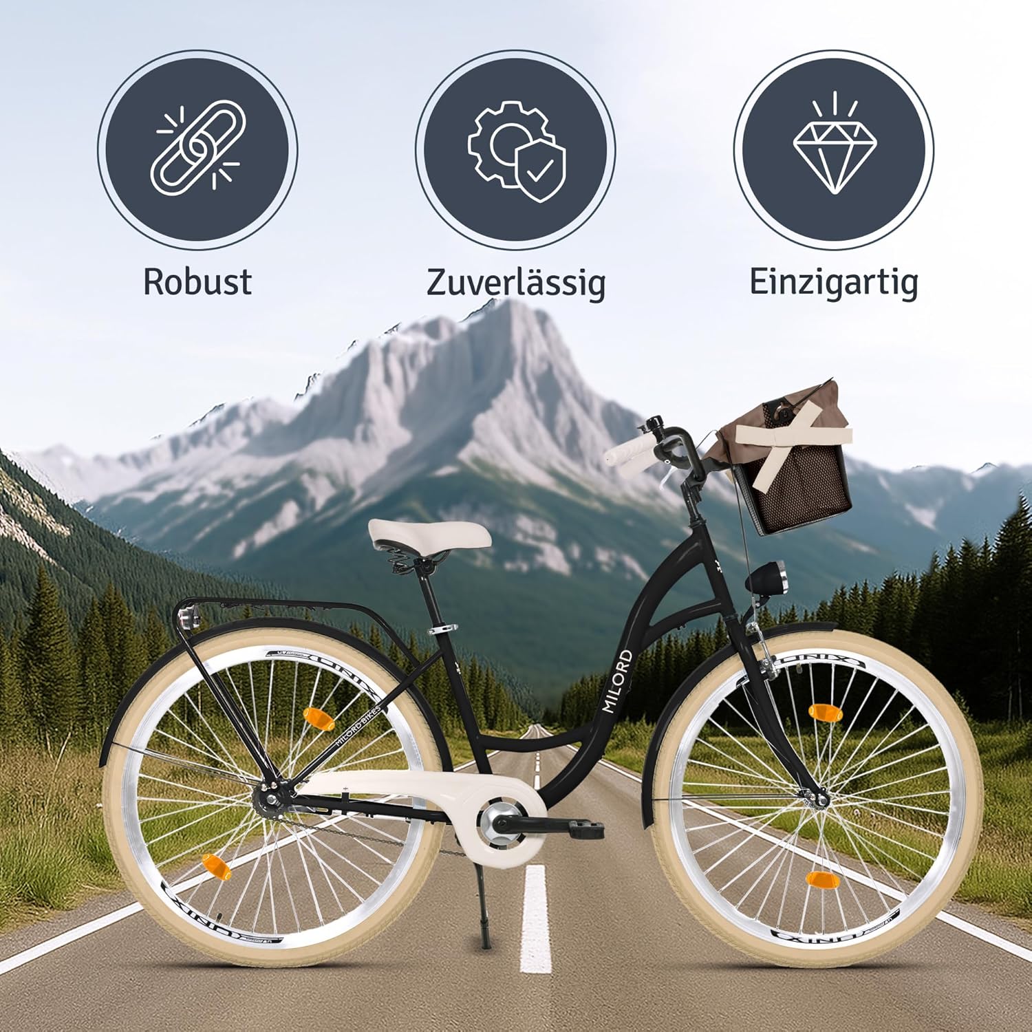 Mit dem Comfort Bicycle City Bike with Basket Vintage Women’s Bicycle Dutch Bike, 26 Inches, Black/Cream, 1-Speed bekommst du Qualität, Komfort und Stil – perfekt für deine nächste Tour.