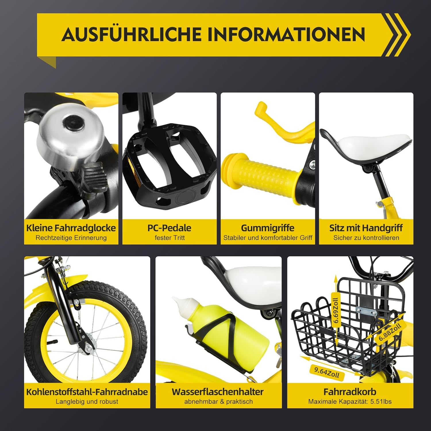 Mit dem DioPaiB Children’s Bicycle 12 Inch Children’s Bicycle with Stabilisers, Children’s Bicycle for from 2-4 Years Boys & Girls, Height Adjustable Bicycle Girls, Load Capacity 176 lbs, Yellow bekommst du Qualität, Komfort und Stil – perfekt für deine nächste Tour.