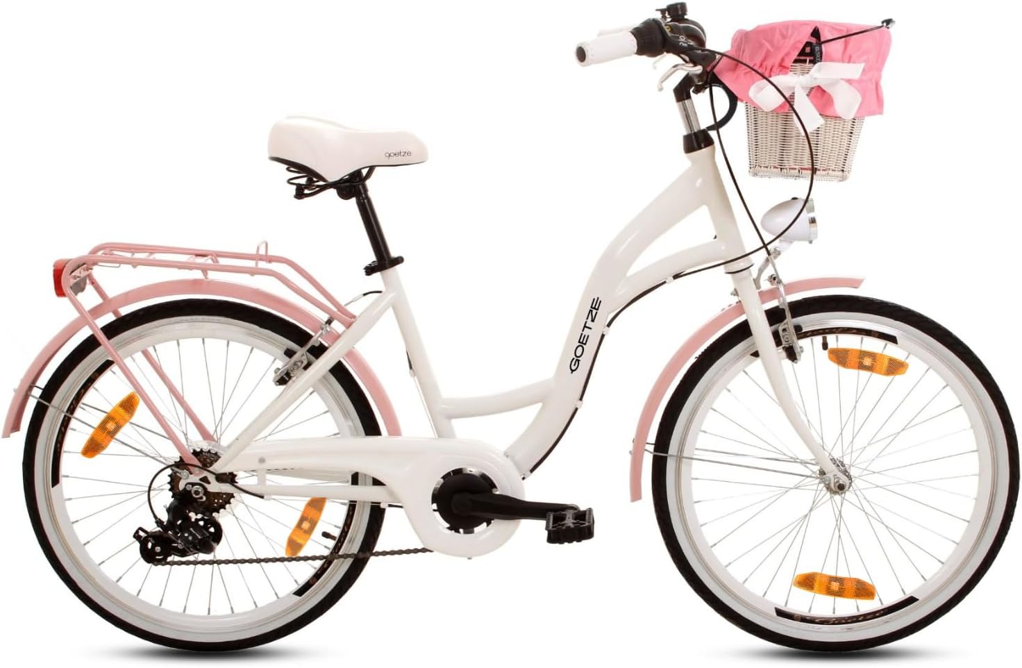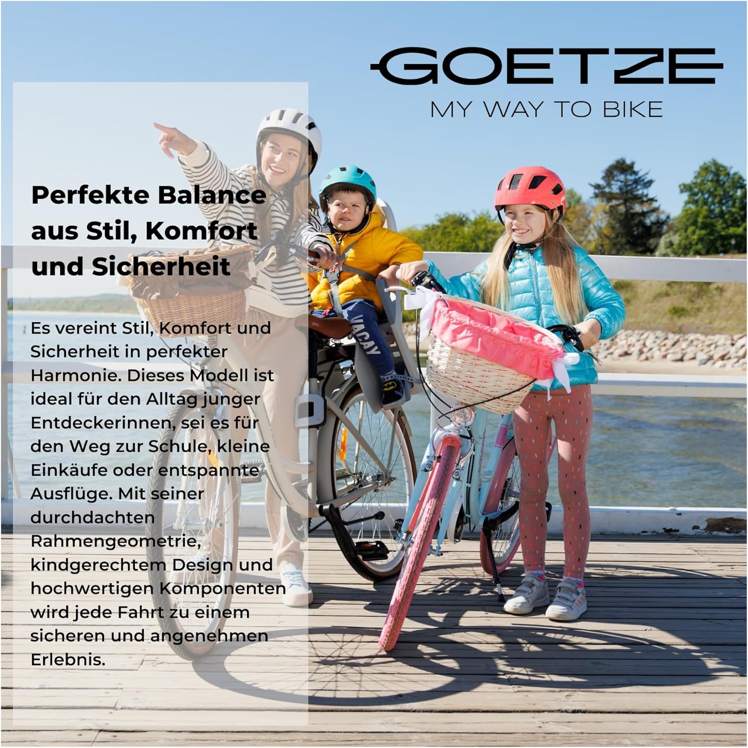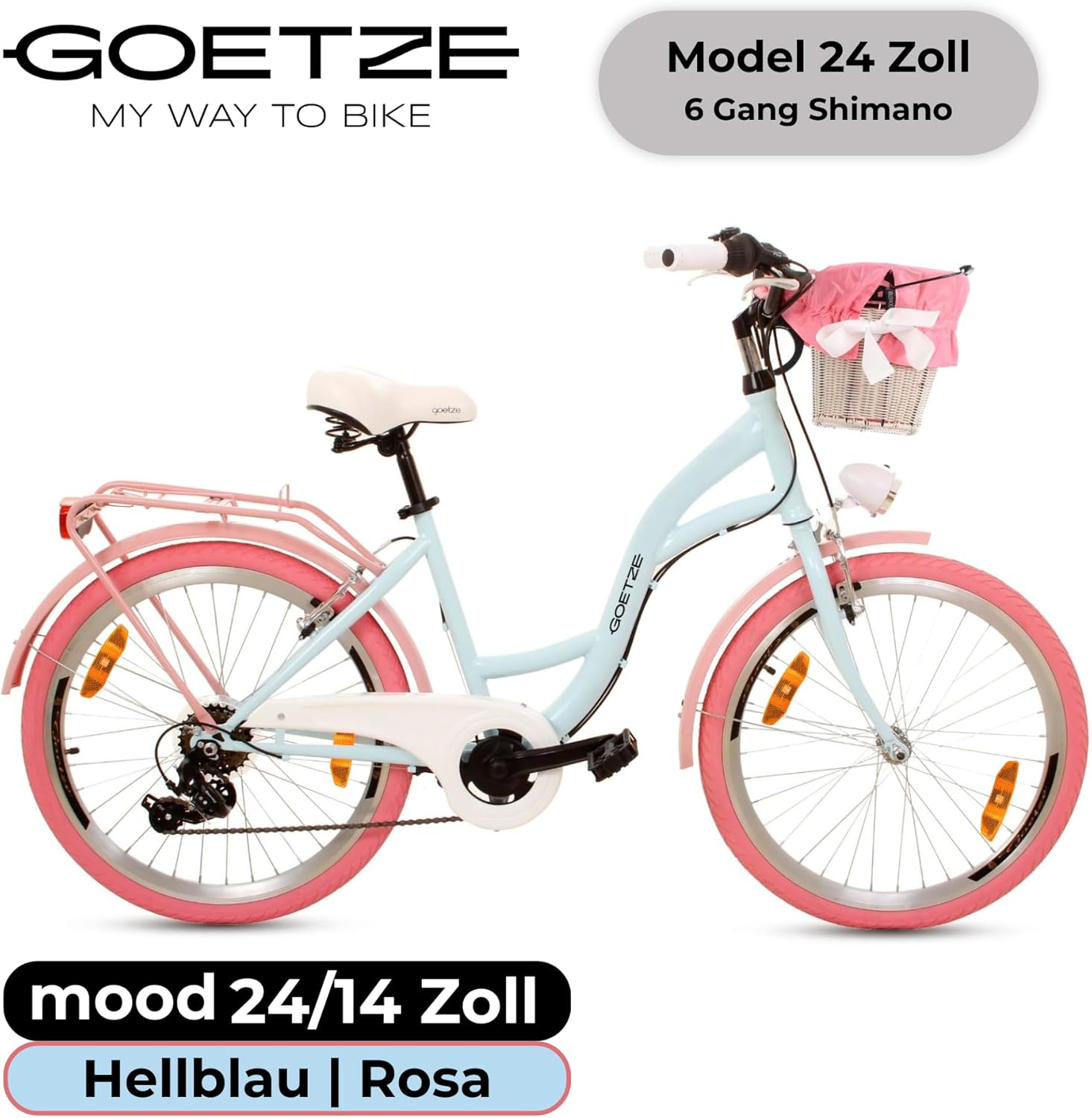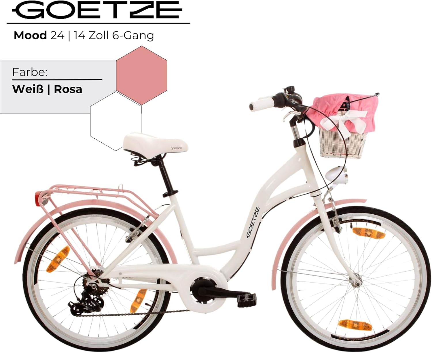 Jetzt entdecken: Goetze Mood 24 inch children’s bicycle, 14 inch low-entry frame, 6-speed derailleur, double V-brakes, LED lighting, pannier rack, rattan basket, comfort saddle, with side stand and bell!