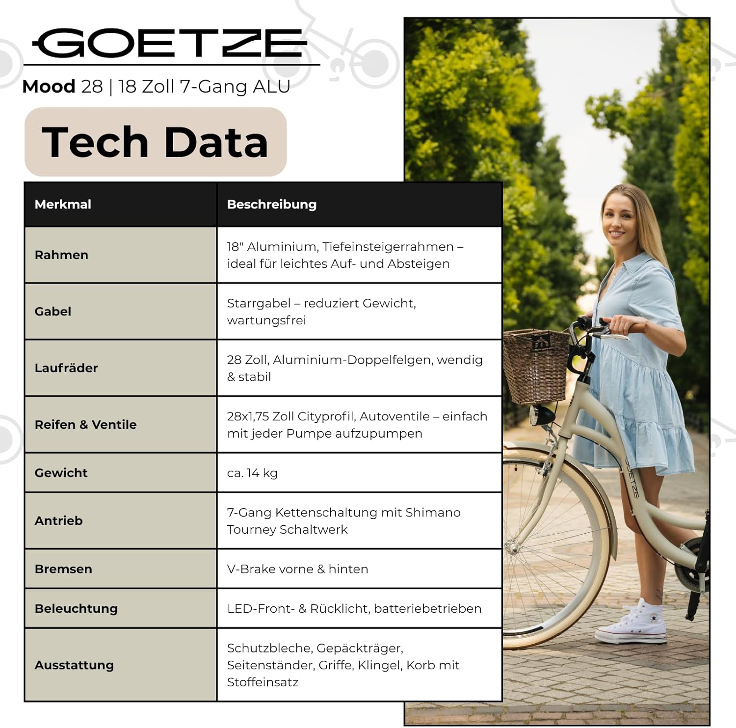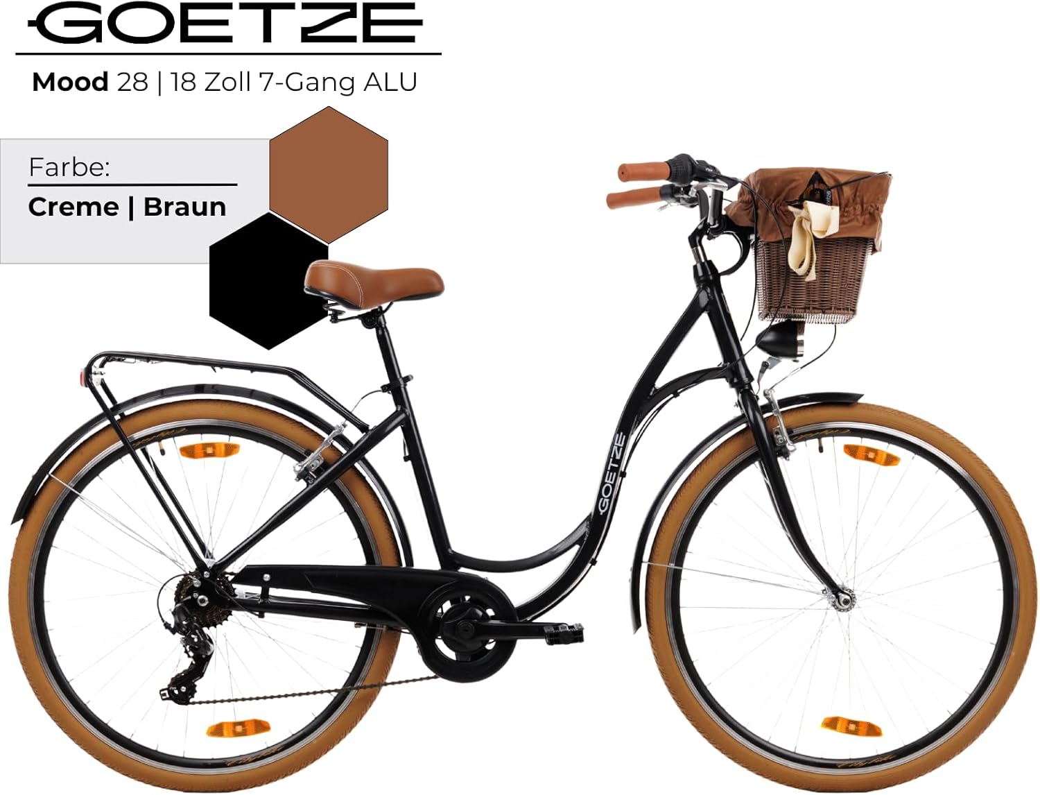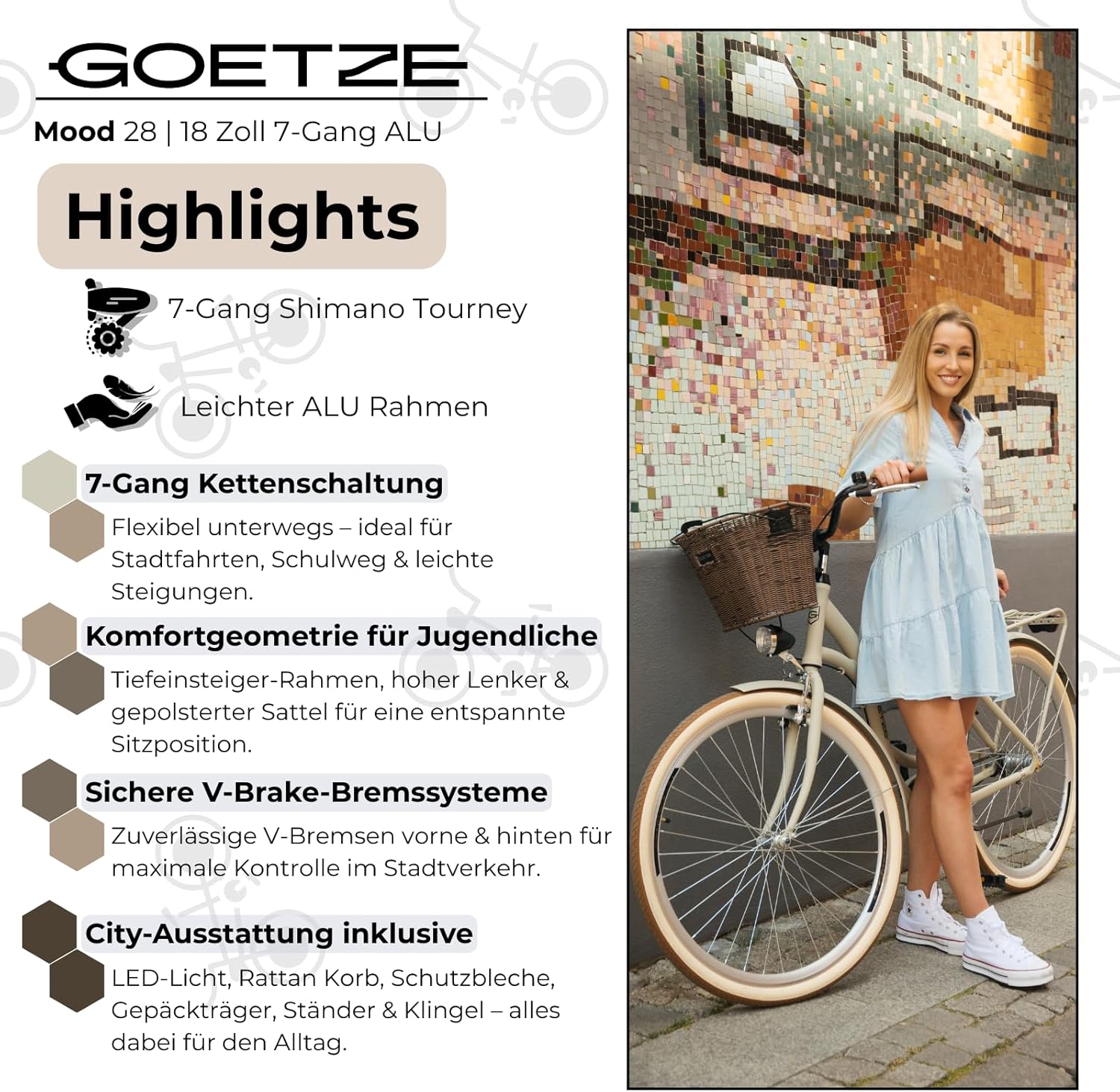 Jetzt entdecken: Goetze Mood Women’s City Bike 28 Inch / 18 Inch Aluminium Frame 7-Speed Derailleur Gears V-Brake LED Lighting Rattan Basket Pannier Rack Low Entry Comfort Saddle