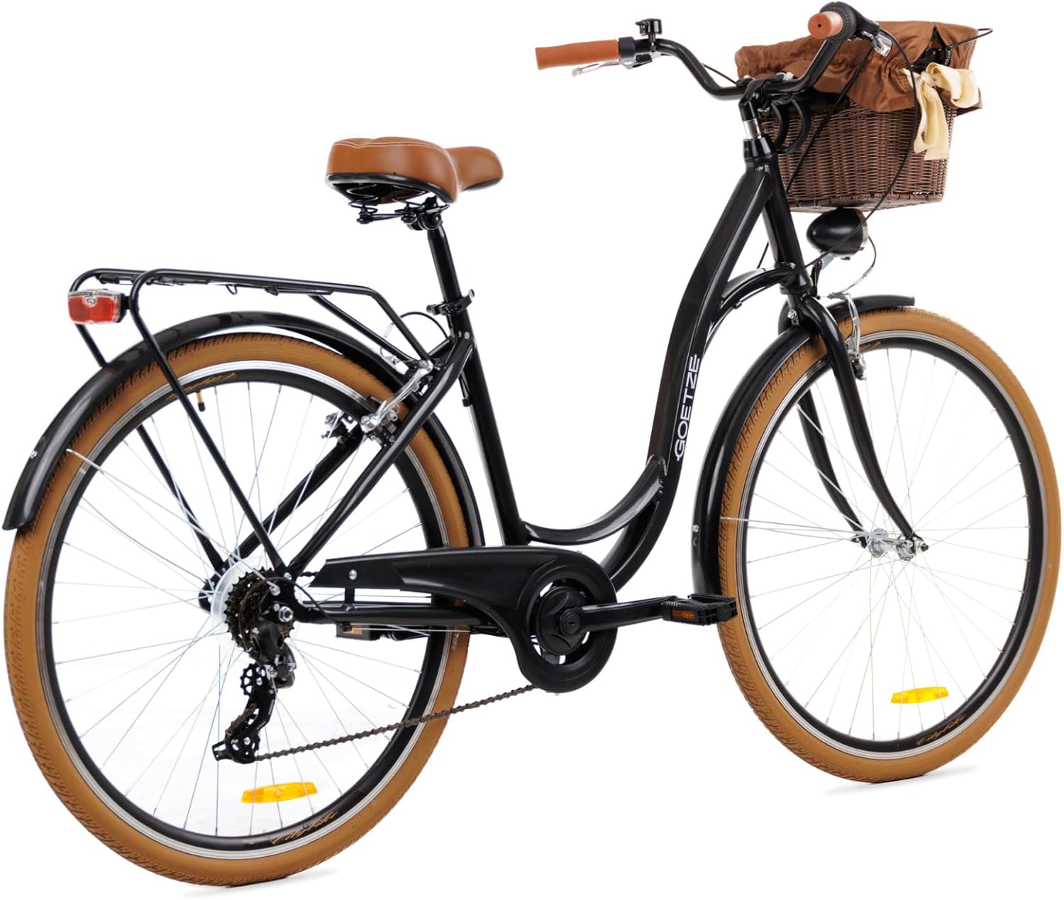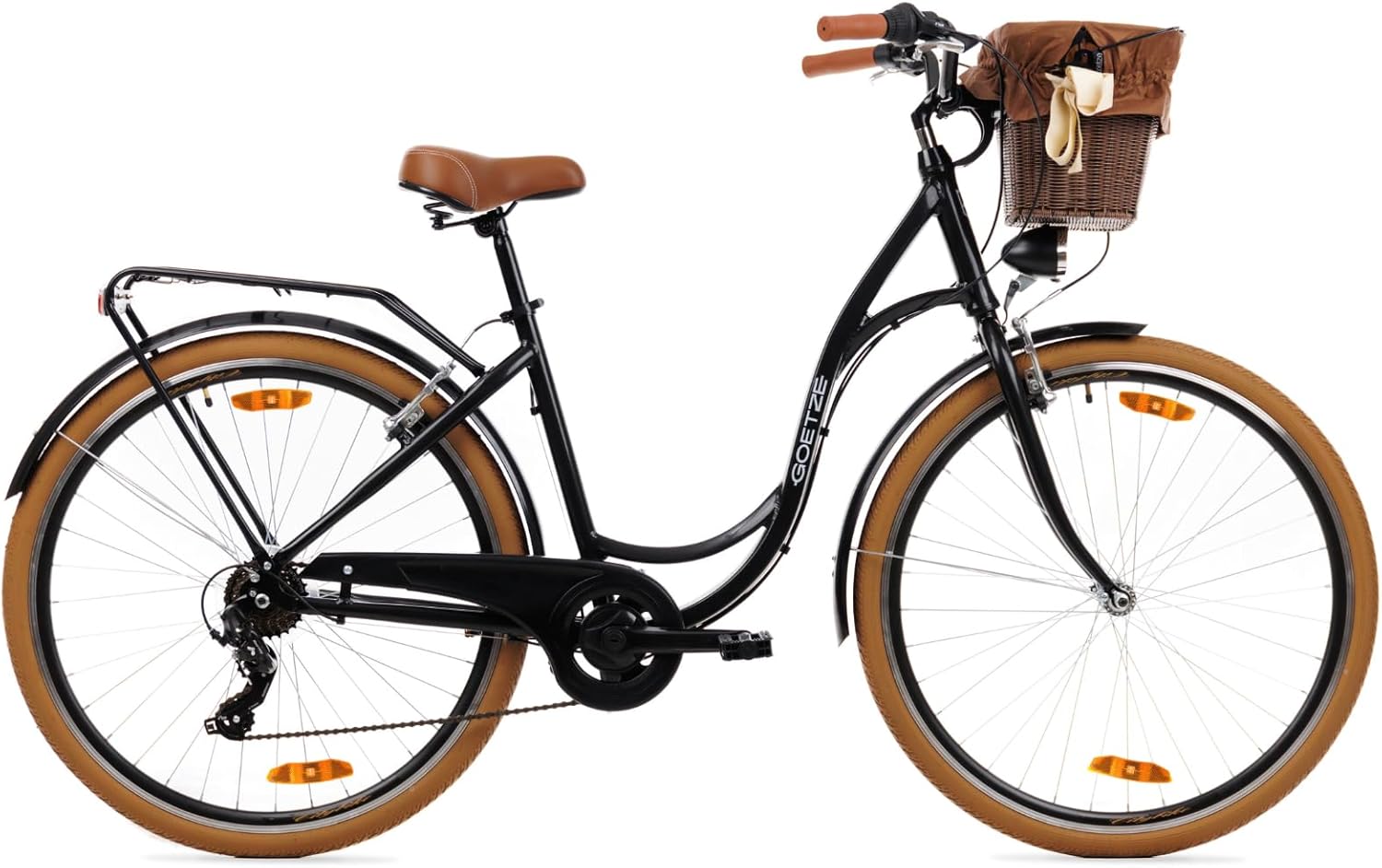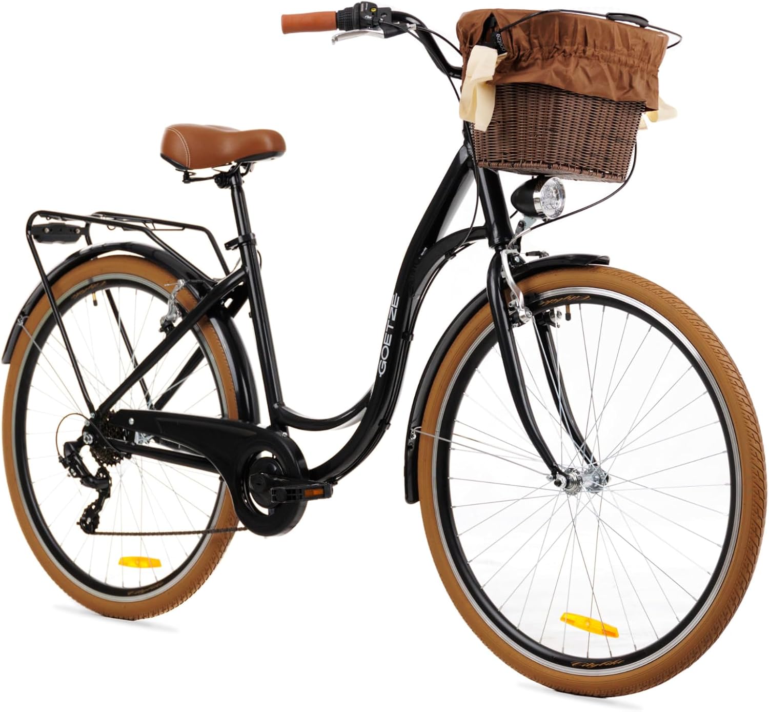 Mit dem Goetze Mood Women’s City Bike 28 Inch / 18 Inch Aluminium Frame 7-Speed Derailleur Gears V-Brake LED Lighting Rattan Basket Pannier Rack Low Entry Comfort Saddle bekommst du Qualität, Komfort und Stil – perfekt für deine nächste Tour.