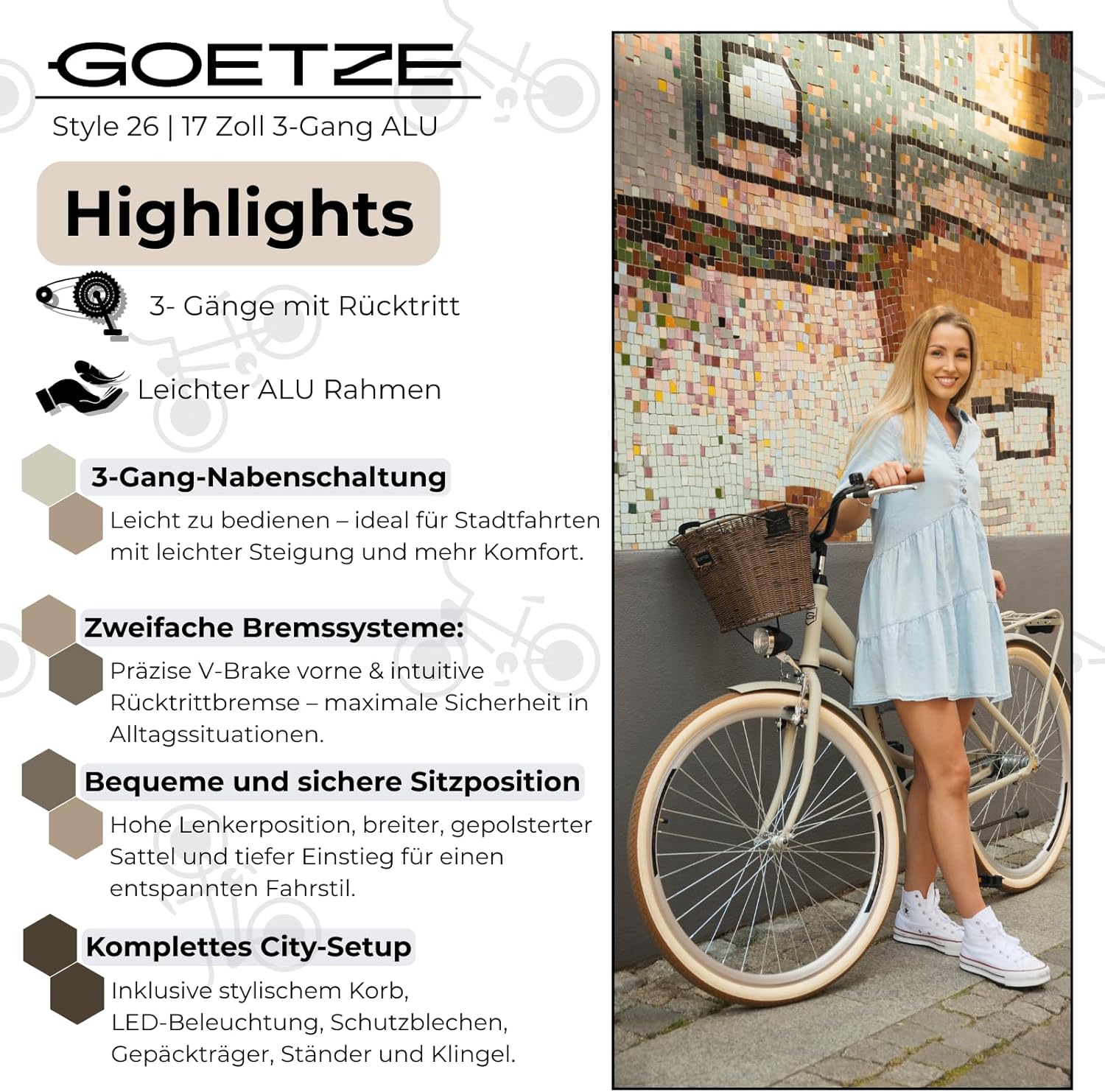 Top-Angebot: Goetze Style 26 Inch Youth City Bike, 17 Inch Low Entry Aluminium Frame, 3-Speed Hub Gears, Coaster Brake, Front V-Brake, LED Lighting, Rattan Basket, Comfort Saddle, with Stand & Bell