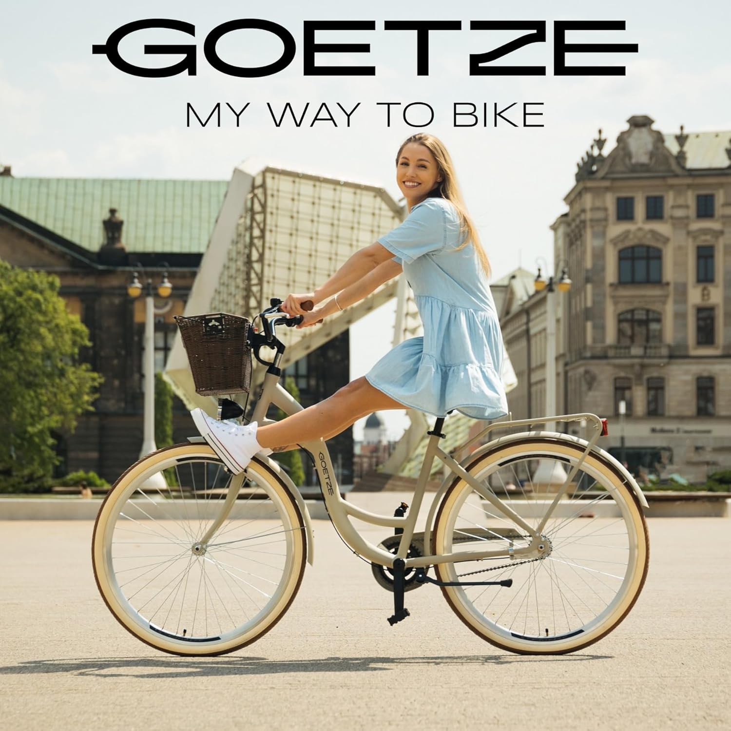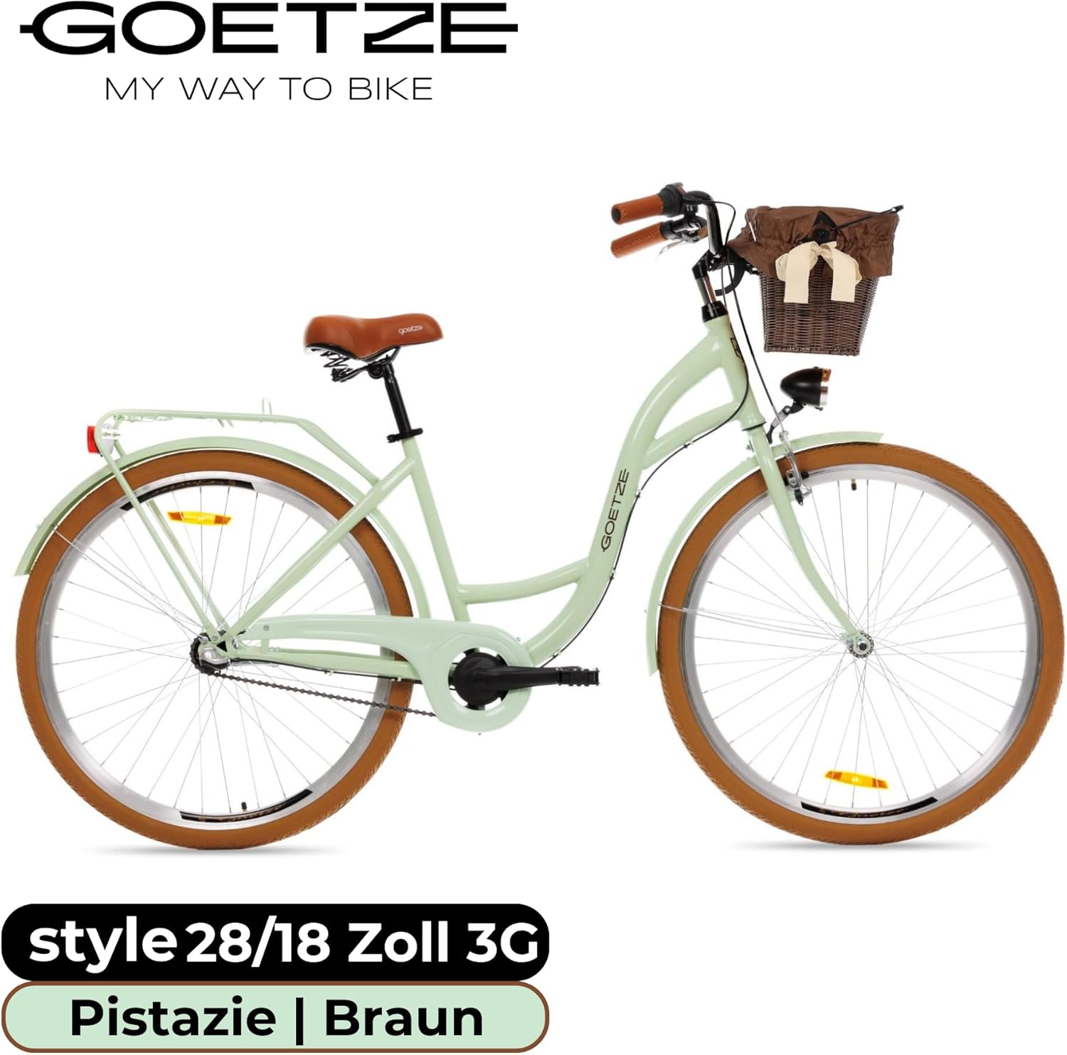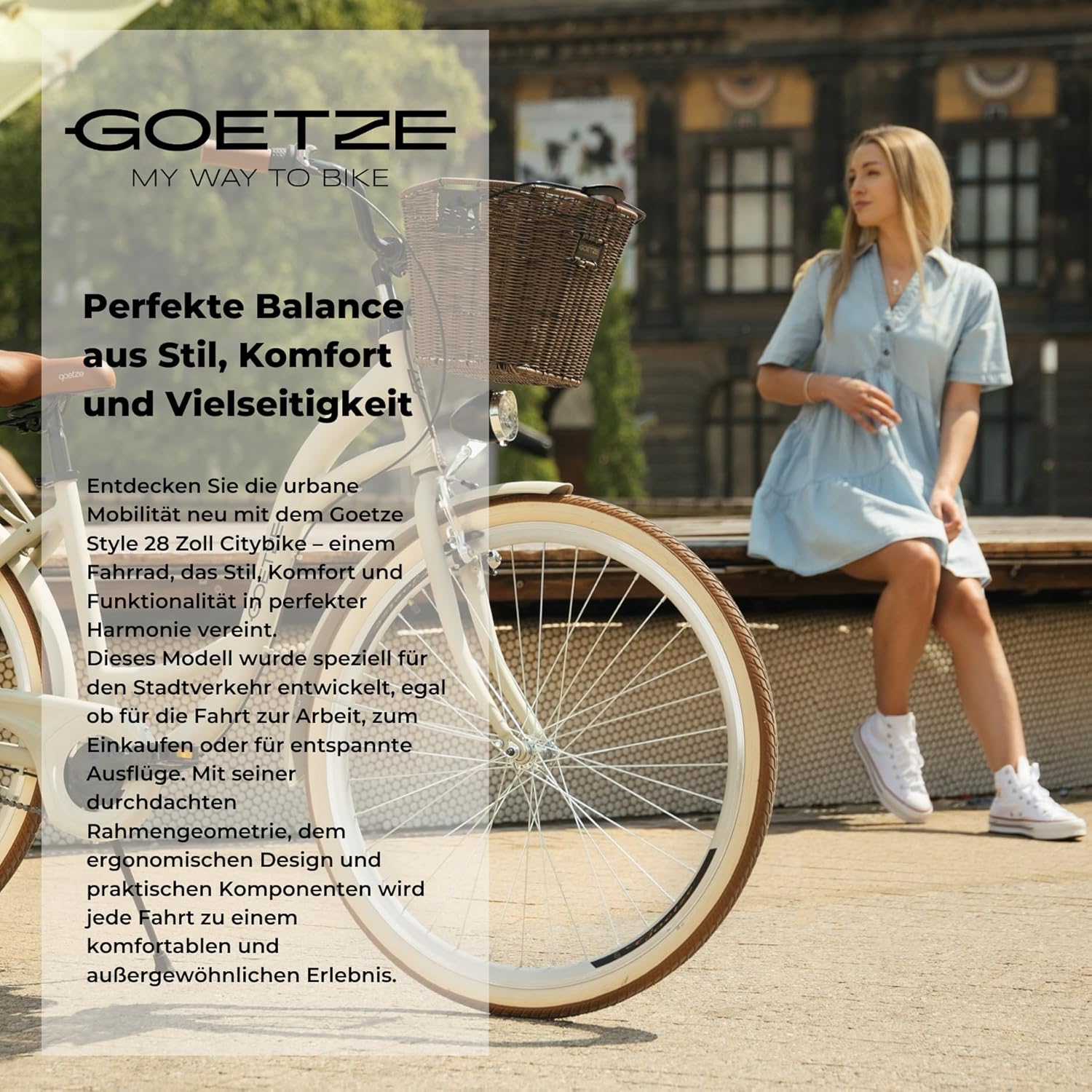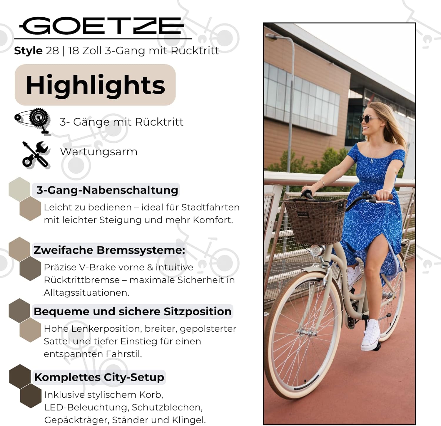 Jetzt entdecken: Goetze Style 28 Inch Women’s City Bike, 18 Inch Low Entry, 3-Speed Hub Gears, Coaster Brake and V-Brake, LED Lighting, Rattan Basket, Comfort Saddle, with Side Stand and Bell