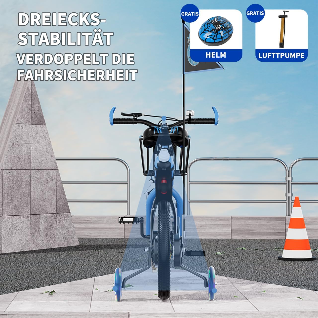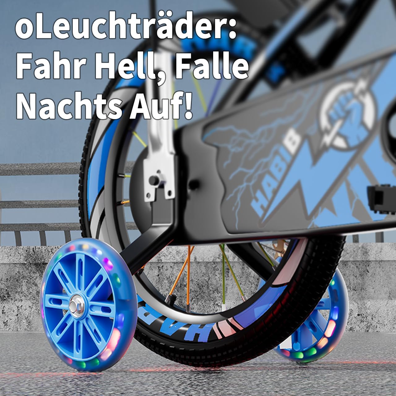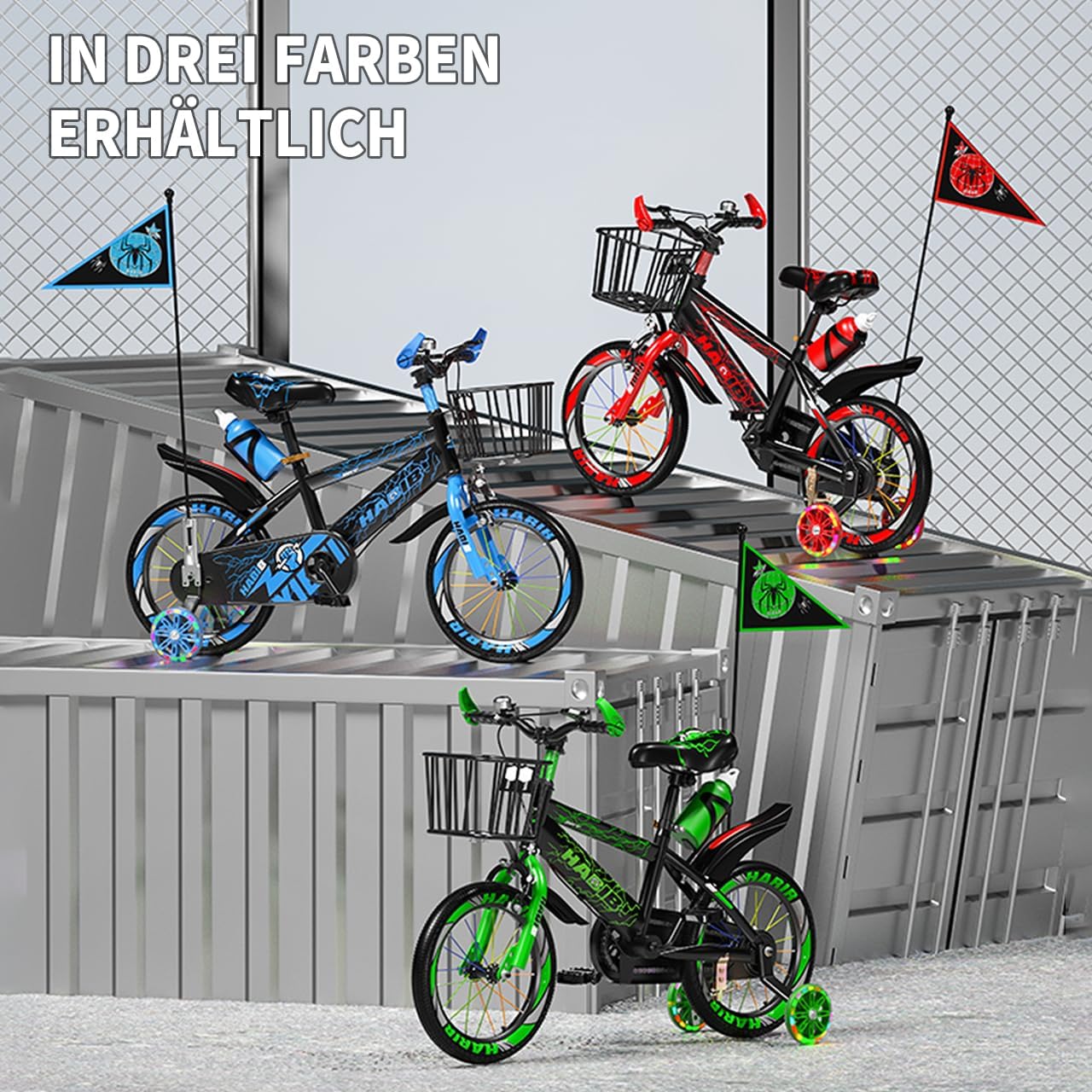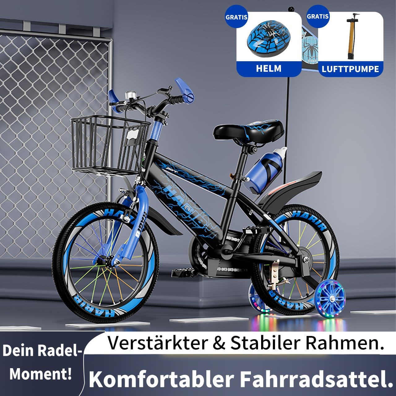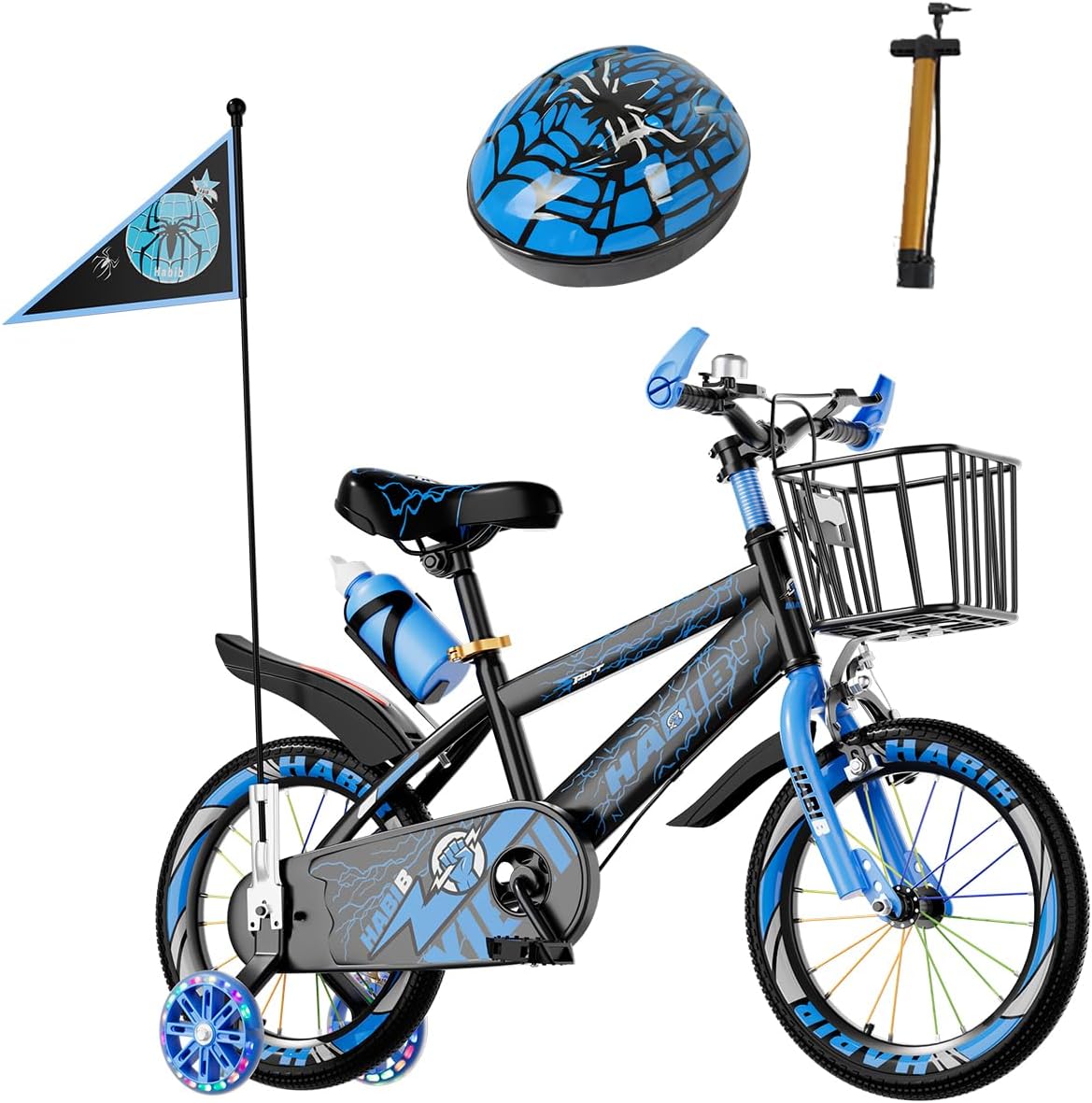 Top-Angebot: Habib Gruppe Children’s Bicycle Boys Bicycle 12 14 16 Inch from 3 Years – with LED Stabilisers, Basket, Bell & Free Helmet & Pump, Front Brake