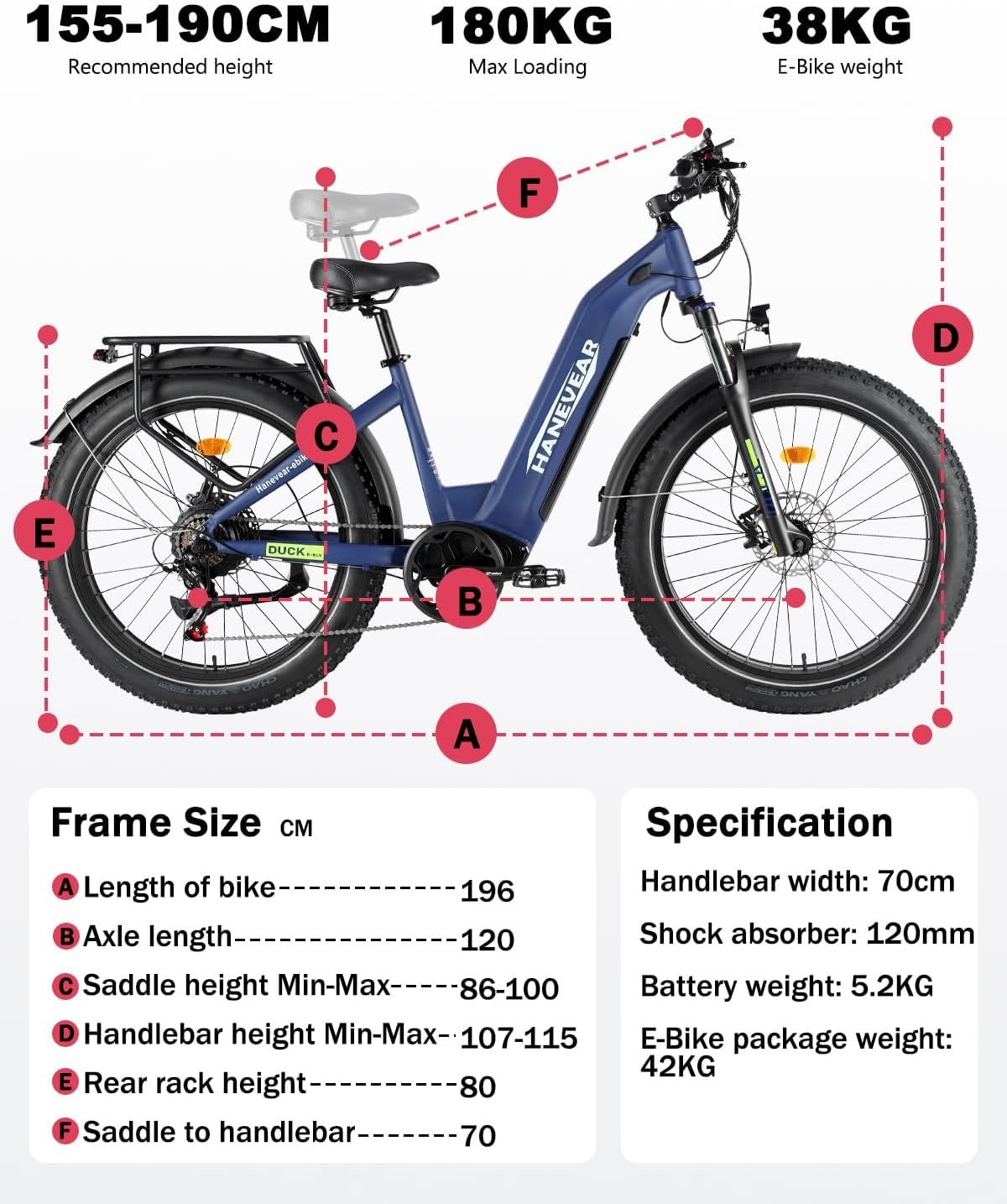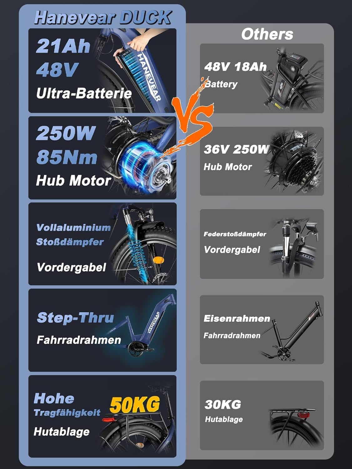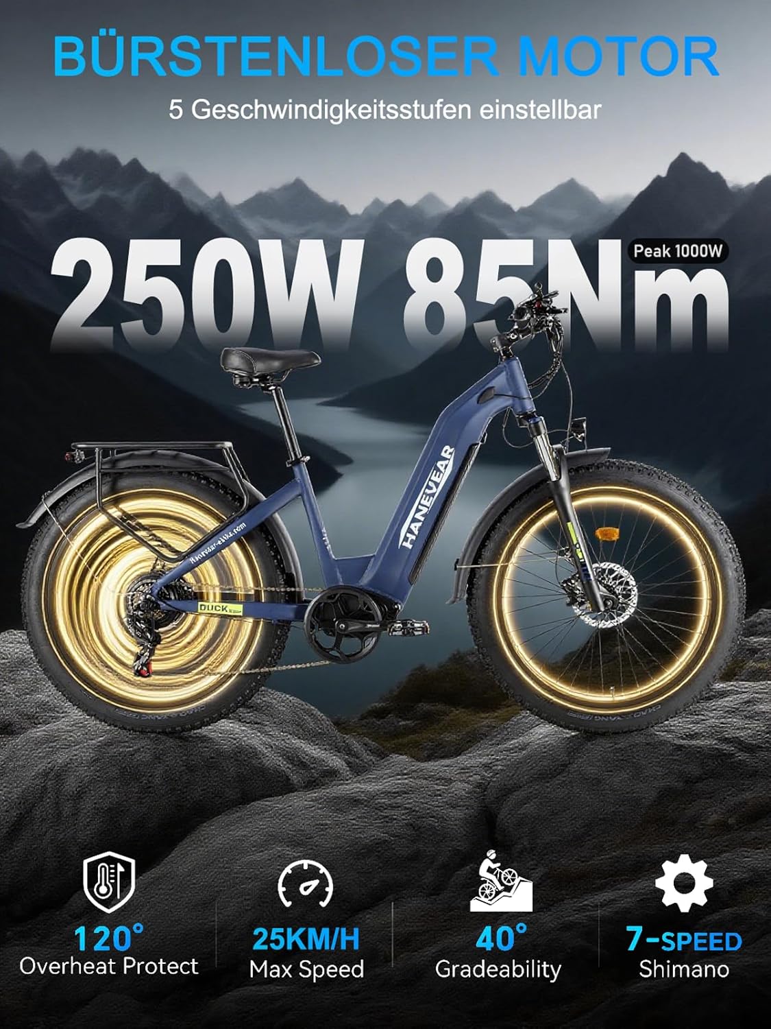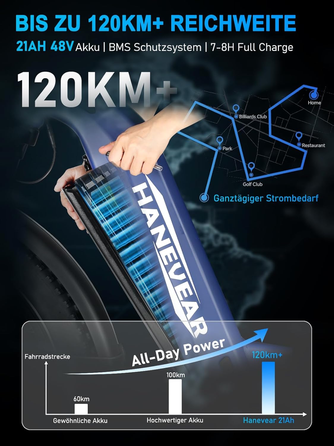 Jetzt entdecken: HANEVEAR Electric Bicycle for Adults, 21 Ah 48 V Replaceable Battery, 250 W 85 Nm E Fat Bike, Max. Range 120 km+, Double Oil Brakes, Electric Mountain Bike 26 x 4.0 Inch Off-Road Ebike