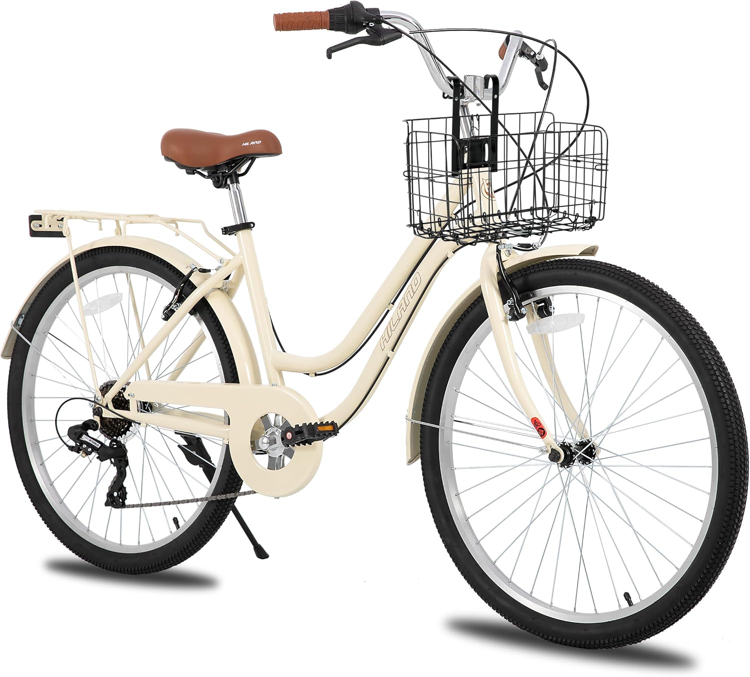 Top-Angebot: Hiland 26 Inch Beach Cruiser Bike for Men and Women, Step-Through Frame, City Bikes for Adults with Pannier Rack and Basket, Men and Women, 7-Speed Commuter City Bicycle