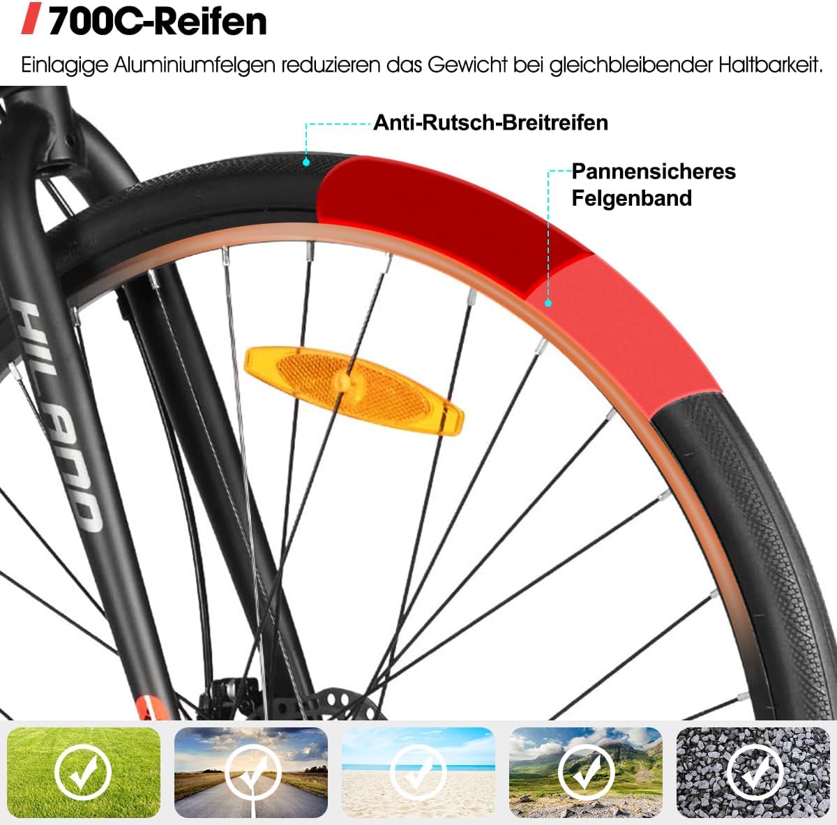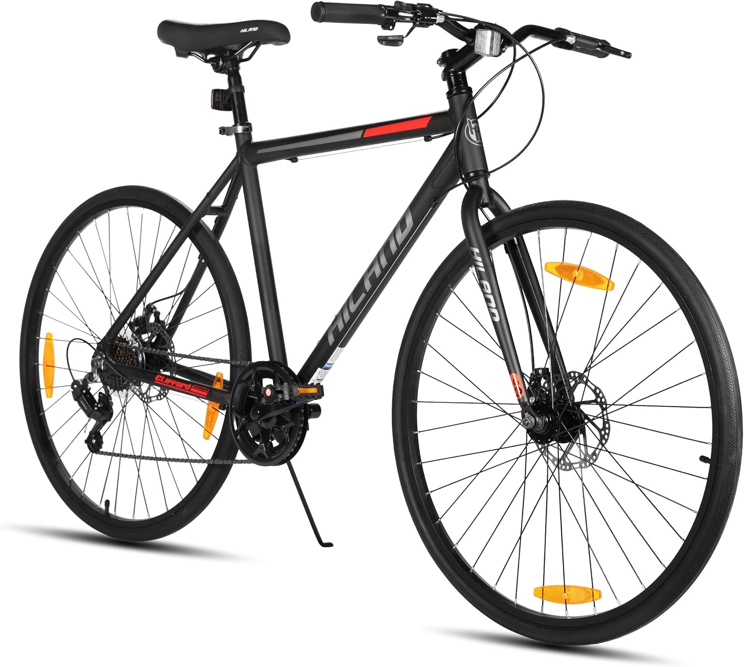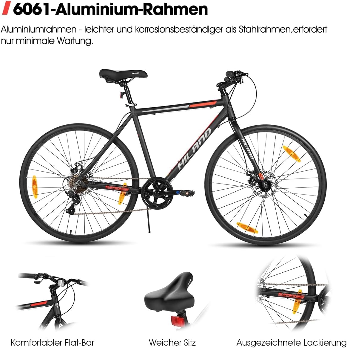 Jetzt entdecken: Hiland 700C Road Bike Men and Women, Aluminium Frame, 7 Speed Road Bike with Double Disc Brakes, Frame Height 530 mm/570 mm, 28 Inch Road Bike for Commuting, Black/Red/Silver