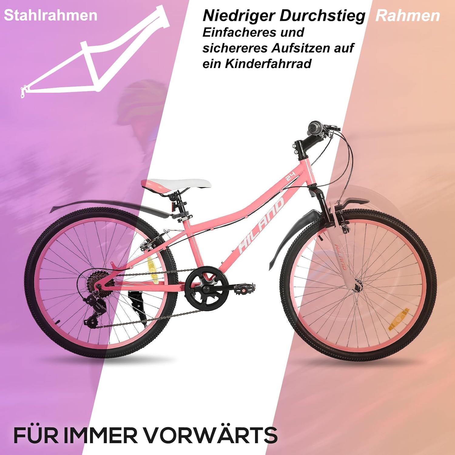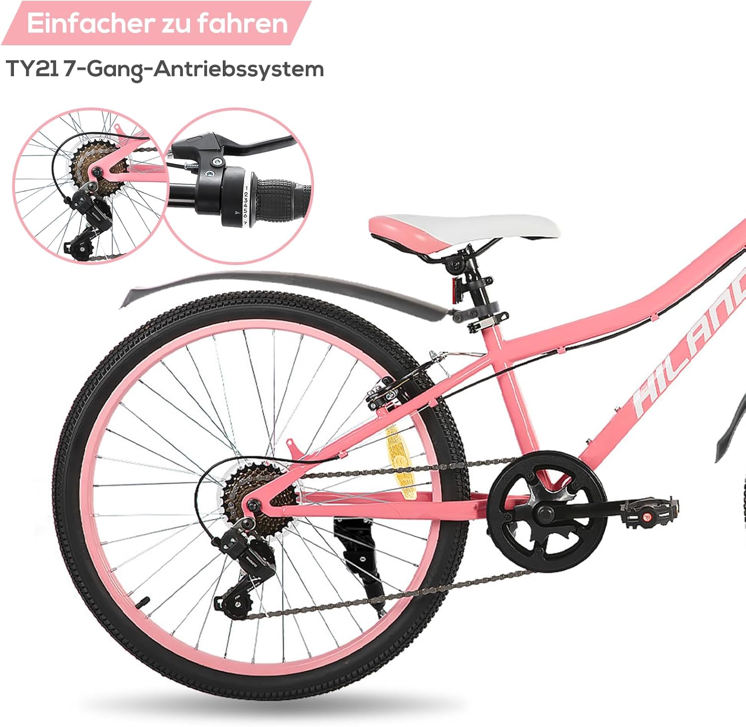 Mit dem Hiland Climber 24 Zoll Kinderfahrrad, Kinder Mountainbike Jugend Mädchen mit Federgabel 7 Gang, Kinder MTB mit V-Bremse, Schwarz/Blau/Mintgrün/Rosa bekommst du Qualität, Komfort und Stil – perfekt für deine nächste Tour.