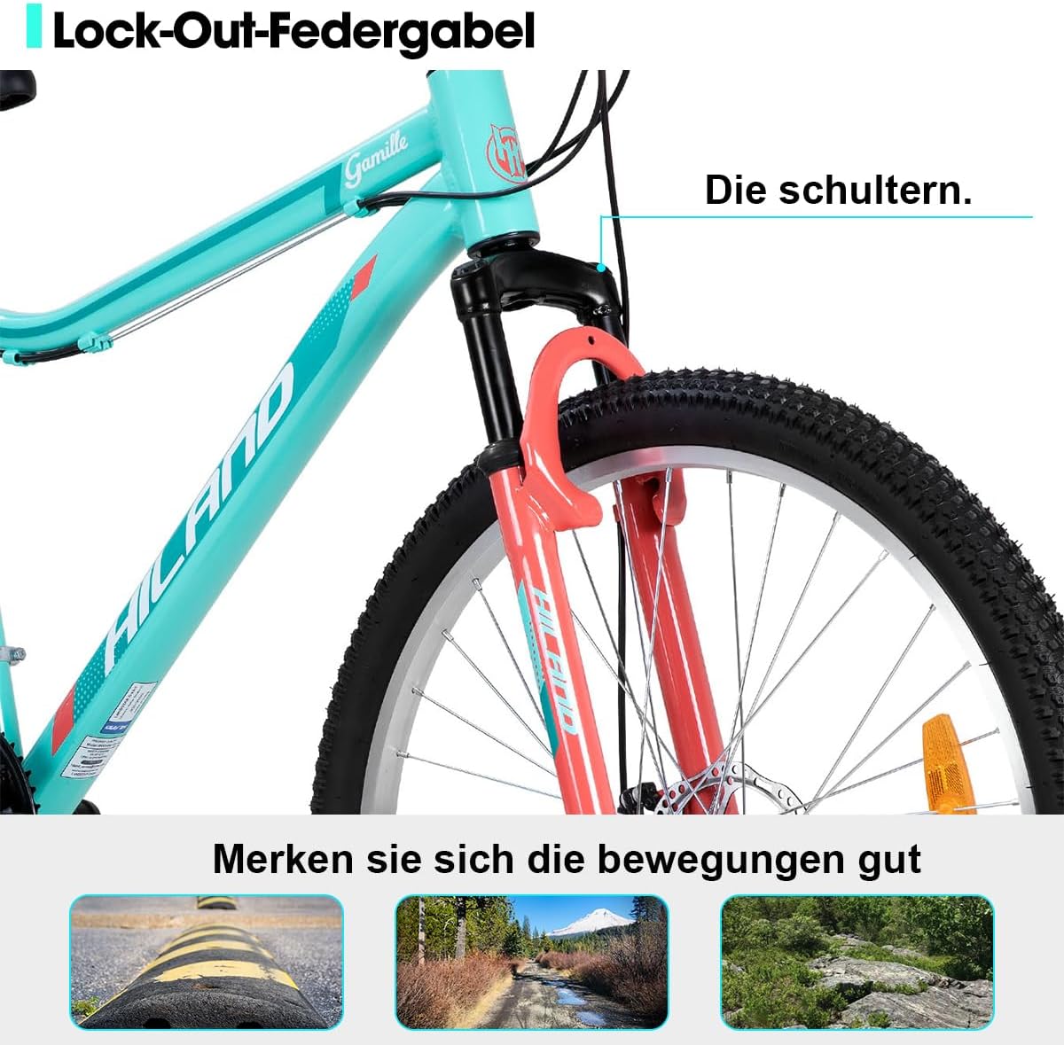 Mit dem Hiland Women’s Mountain Bike 26/27.5 Inch Aluminium Frame 18 Speed MTB for Women, Ladies and Girls Mountain Bike with Double Disc Brake Suspension Fork, Mint Green/Purple bekommst du Qualität, Komfort und Stil – perfekt für deine nächste Tour.