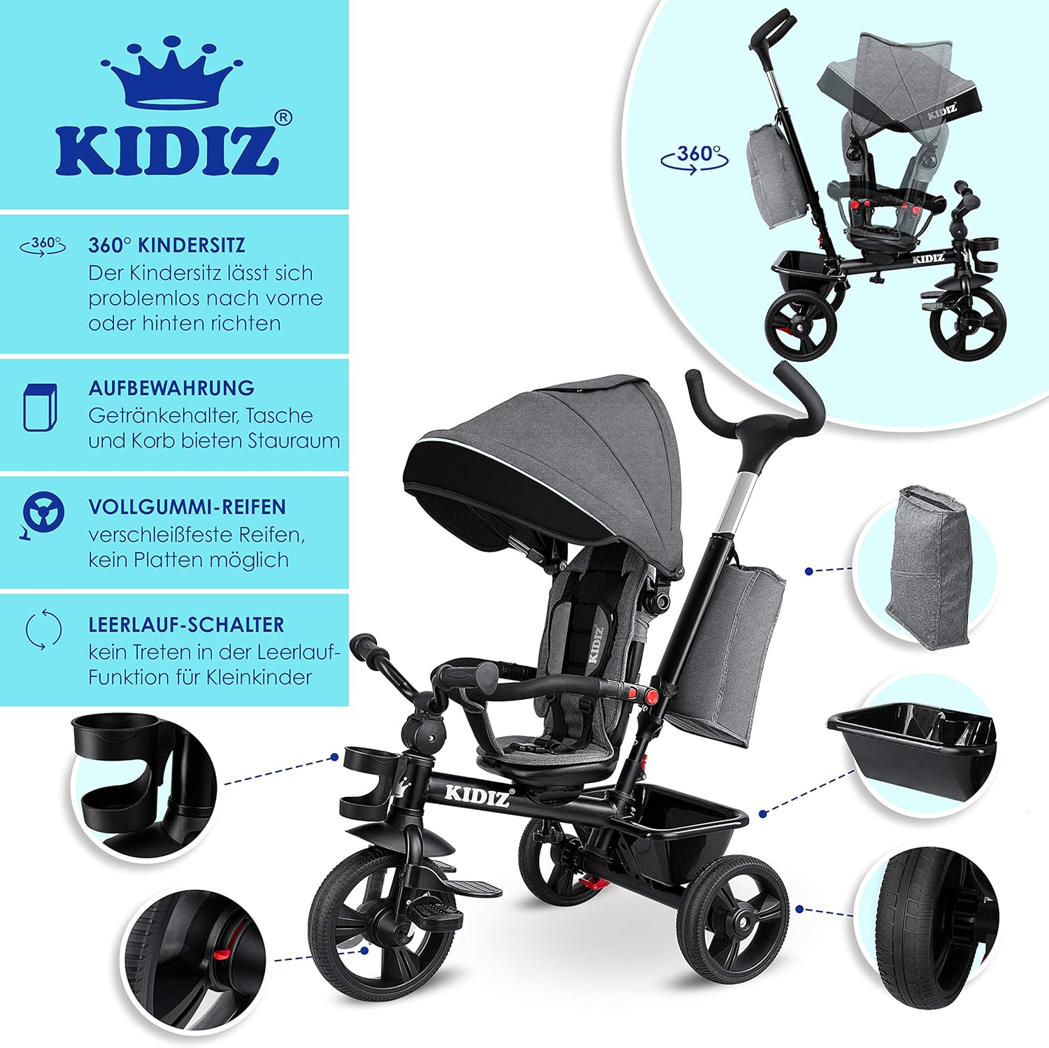 Jetzt entdecken: KIDIZ® Tricycle 5-in-1 Children’s Tricycle with Push Bar Steering System Bar from 1 Year Forward and Reverse Ride Jogger, Basket Bag Drink Holder Sun Canopy Rubber Wheels, Buggy, Bicycle, Foldable