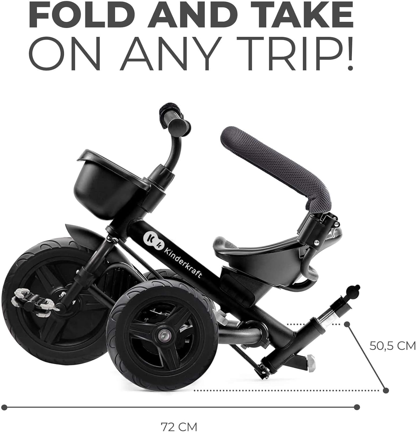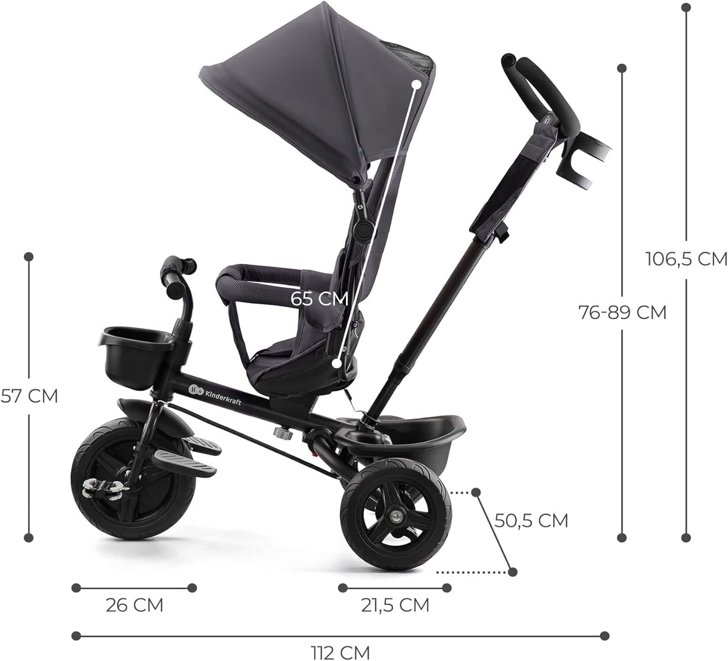 Mit dem Kinderkraft Aveo Tricycle from 9 Months to 25 kg, Children’s Tricycle with Push Bar, Compact Folding, Rotating Seat, Fold-Out Hood with Sun Protection, Drink Holder Basket in Set, Dark Grey bekommst du Qualität, Komfort und Stil – perfekt für deine nächste Tour.