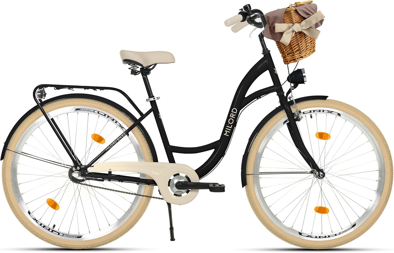 Jetzt entdecken: MILORD. 28 Inch 3-Speed, Black and Cream, Comfort Bicycle with Basket and Back Carrier, Dutch Bike, Women’s Bike, City Bike, Retro, Vintage