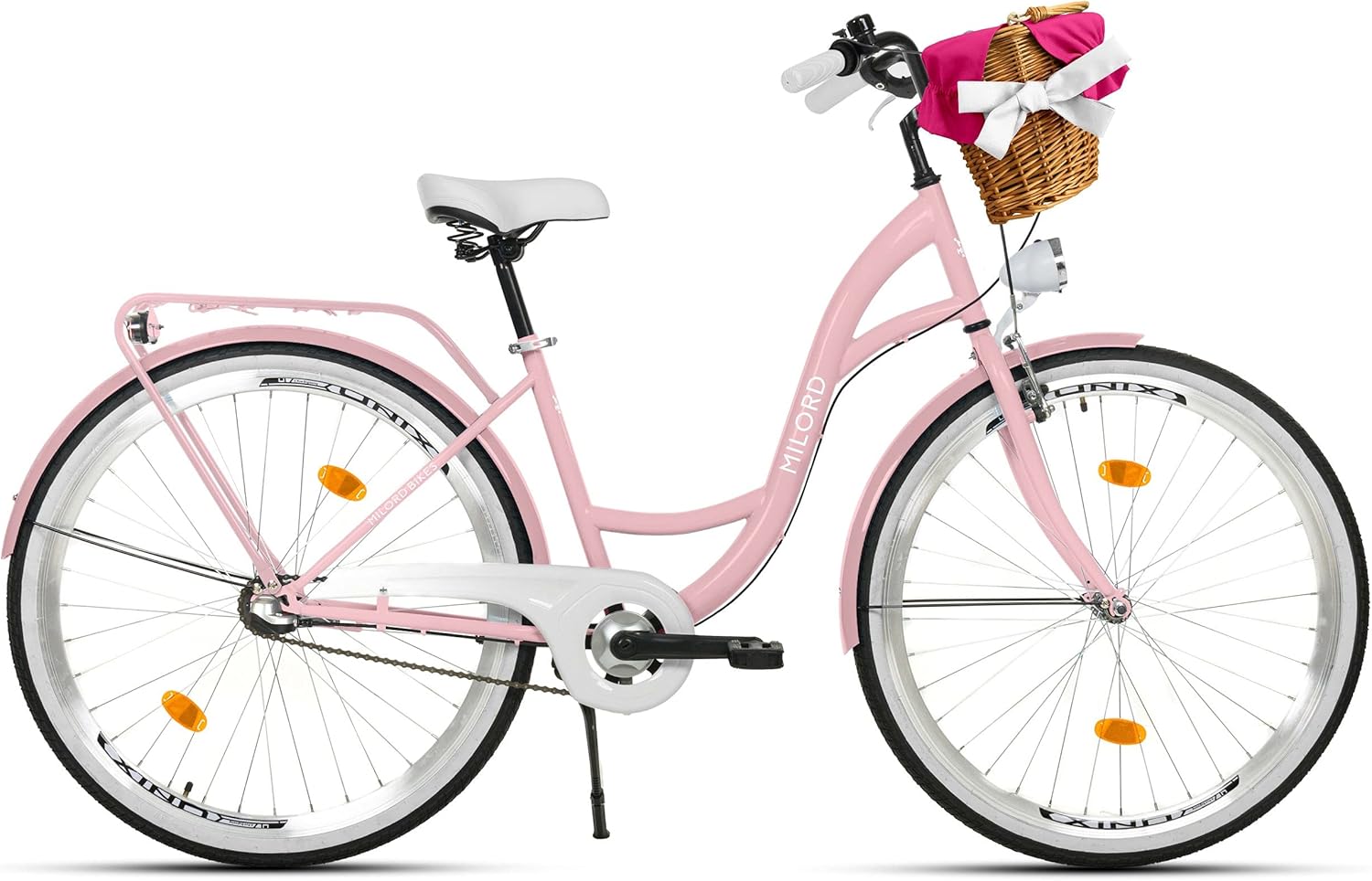Das Milord. 28 Inch 3-Speed Pink Comfort Bicycle with Basket and Back Carrier, Holland Bike, Women’s Bike, City Bike, Retro, Vintage ist ideal für Alltagspendler, die ein zuverlässiges Fahrrad suchen.
