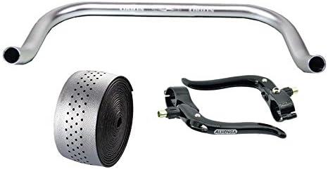 Jetzt entdecken: Permanent-Fahrrad Bullhorn Fixie Single Speed Road Bike Triathlon Handlebar Silver 440 mm with Matching Brake Lever and Silver Handlebar Tape