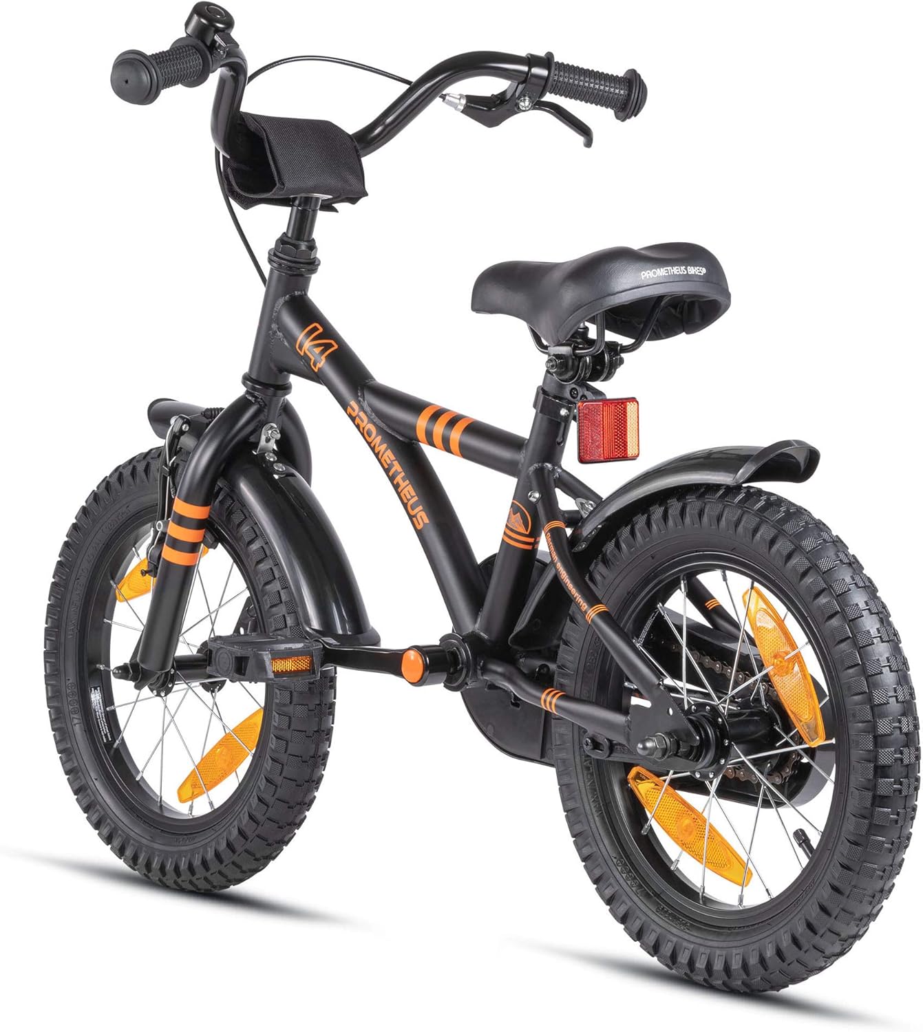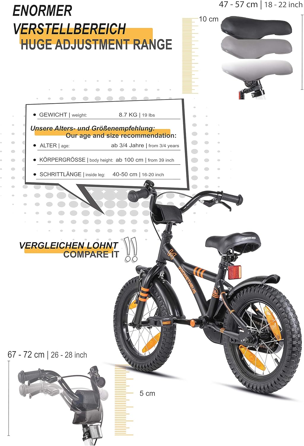 Mit dem PROMETHEUS BICYCLES Children’s Bicycle 14 Inch from 4 Years – Children’s Bicycle Girls Boys Bicycle Children with Stabilisers Coaster Brake in Black Matt Orange bekommst du Qualität, Komfort und Stil – perfekt für deine nächste Tour.