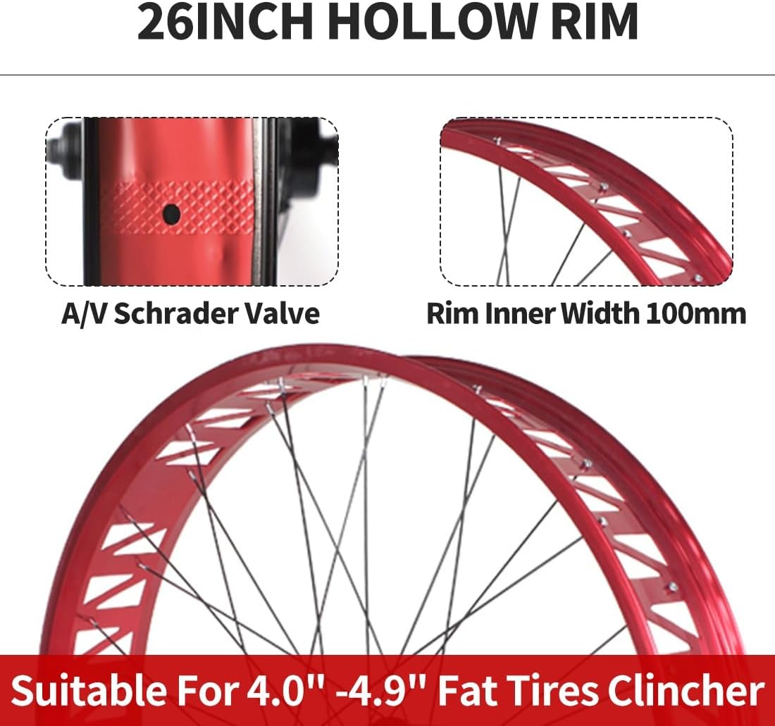 Top-Angebot: QHYRZE 26 Inch Fatbike Wheelset 4.0-4.9 Inch Tyres Front Wheel Rear Wheel 36h Rim Quick Release Bicycle Wheel 135 mm/190 mm Disc Brake Hub for 7-12s Cassette Snow Beach E-Bike (Red, 26 Inch A Pair)