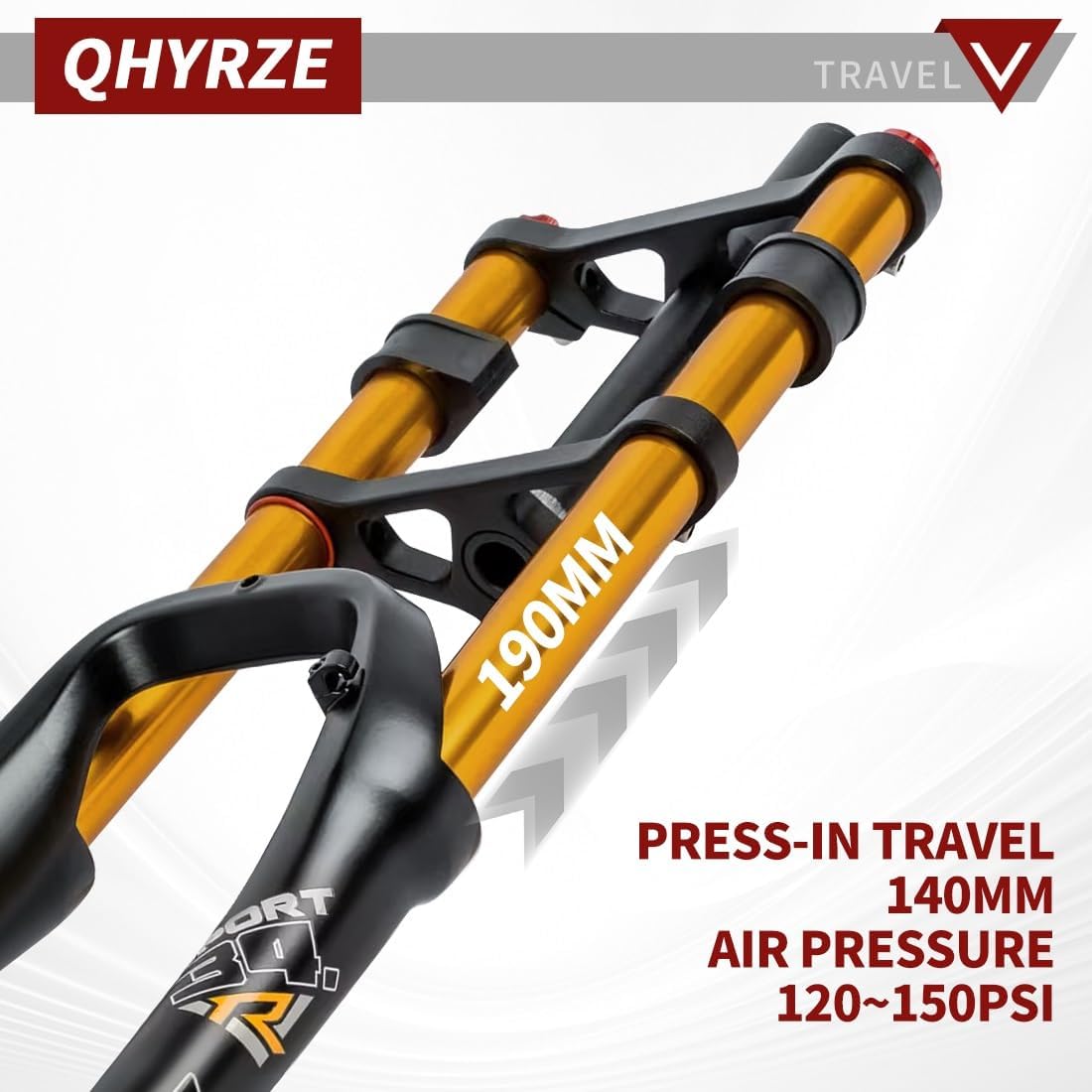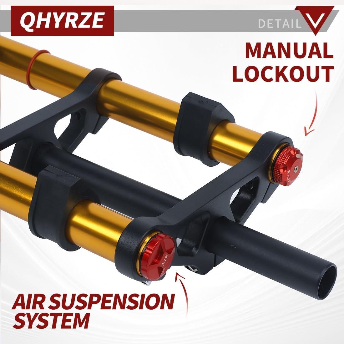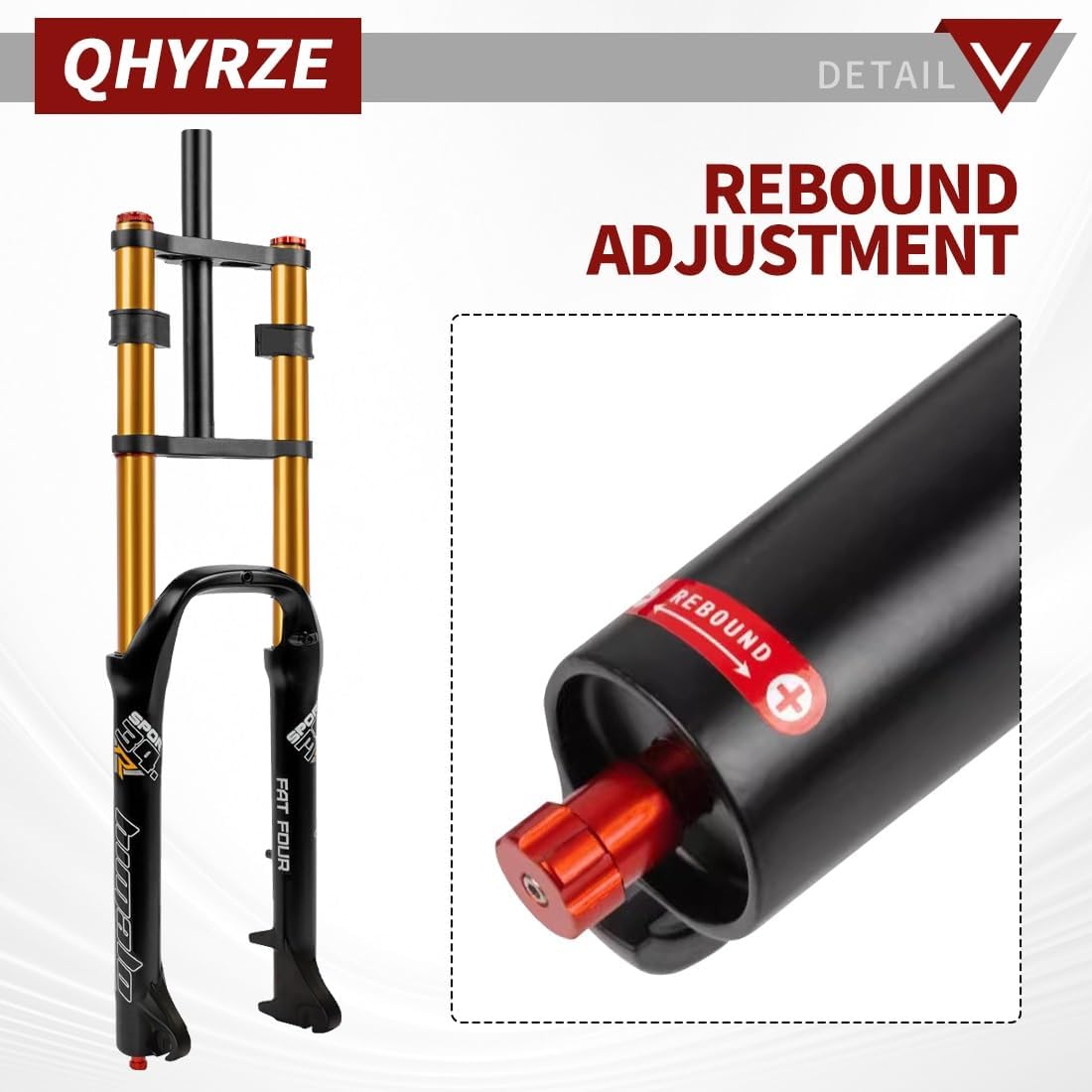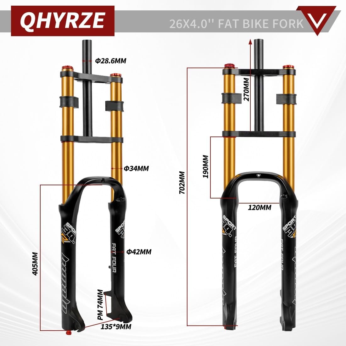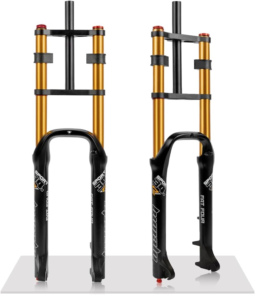 Jetzt entdecken: QHYRZE Fatbike Fork 26 x 4.0 Inch Bicycle Air Suspension Fork for Mountain Bike Ebike, Suspension Travel 140 mm Rebound Adjustment Manual Lock Double Bridge Fork QR Disc Brake Front Fork (Gold)