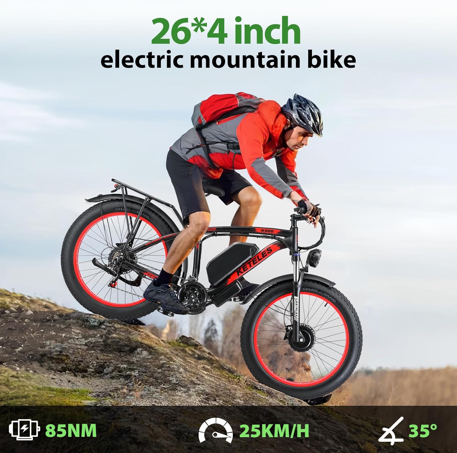 Top-Angebot: QIKAITU Electric Bicycle with Double Motor, Road Legal, 250W Electric Mountain Bike, 26 x 4 Inch Fat Tire Ebike, 48V 23Ah Removable Battery (Blue)