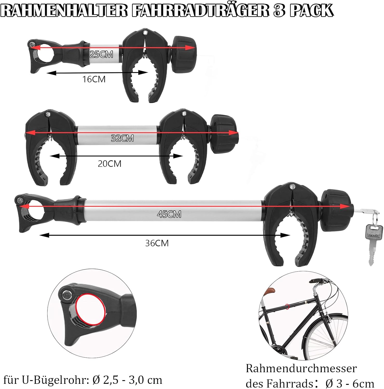 Top-Angebot: Sorlpv Frame holder for bicycle carriers, pack of 3, 25 cm + 32 cm + 45 cm length, universal bicycle frame holder, lockable, aluminium frame holder for U-shaped tube: diameter 2.5-3 cm, frame diameter