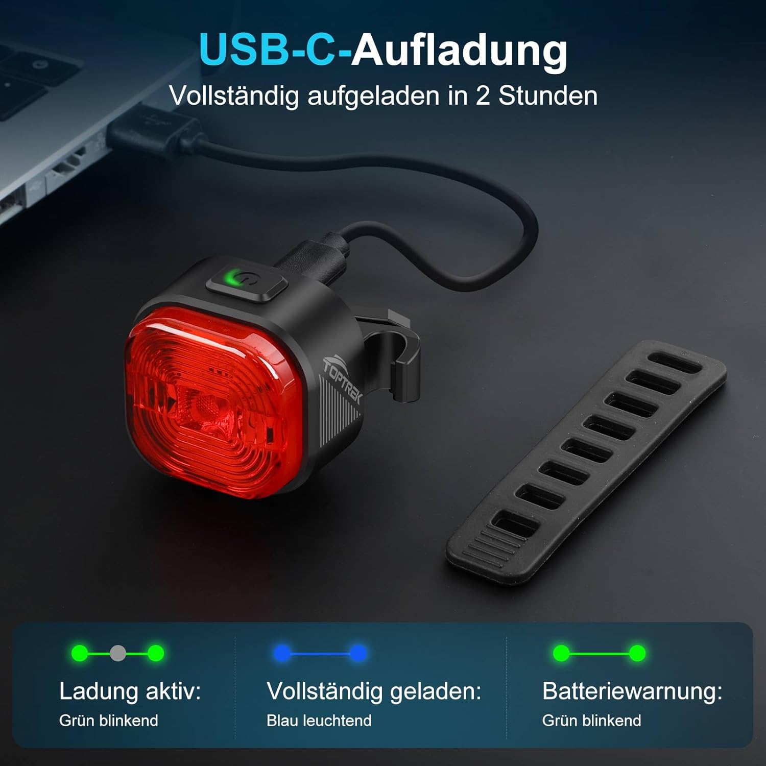 Top-Angebot: toptrek Bicycle Rear Light LED 200 m Vision Range, Rear Light Bicycle 13 Hours Battery Life, StVZO Approved, USB-C Rechargeable, IPX5 Waterproof Bicycle Light Rear for Road Bike E-Bike MTB City Bike