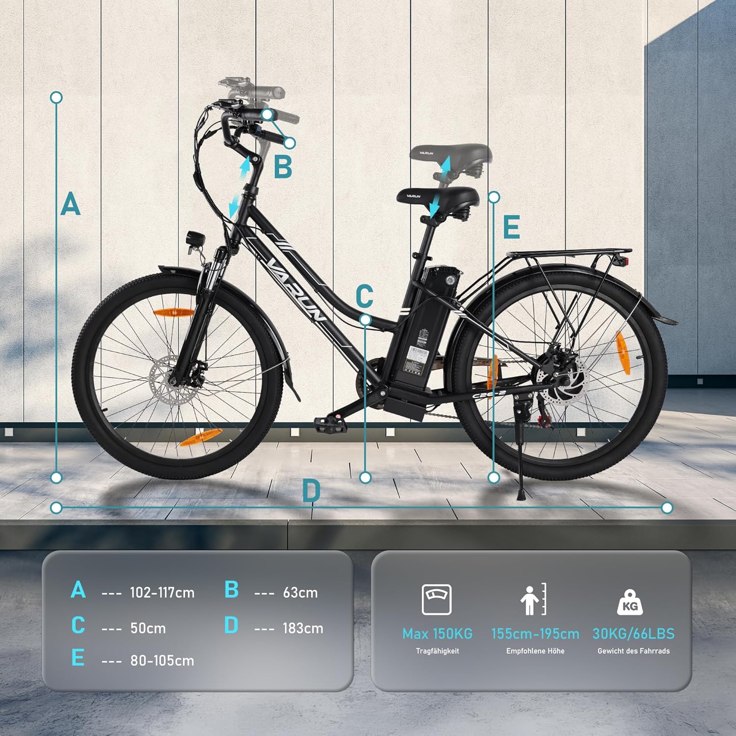 Jetzt entdecken: VARUN E-Bike, 26 Zoll E Bike Damen Herren mit 48V 374.4 Wh Lithium Akku, 250W 55NM Motor, Elektrofahrrad mit 5 Modi, 7-Gang, LCD-Display, E-Fahrrad bis zu 80KM, City Ebike mit EU-Konformes