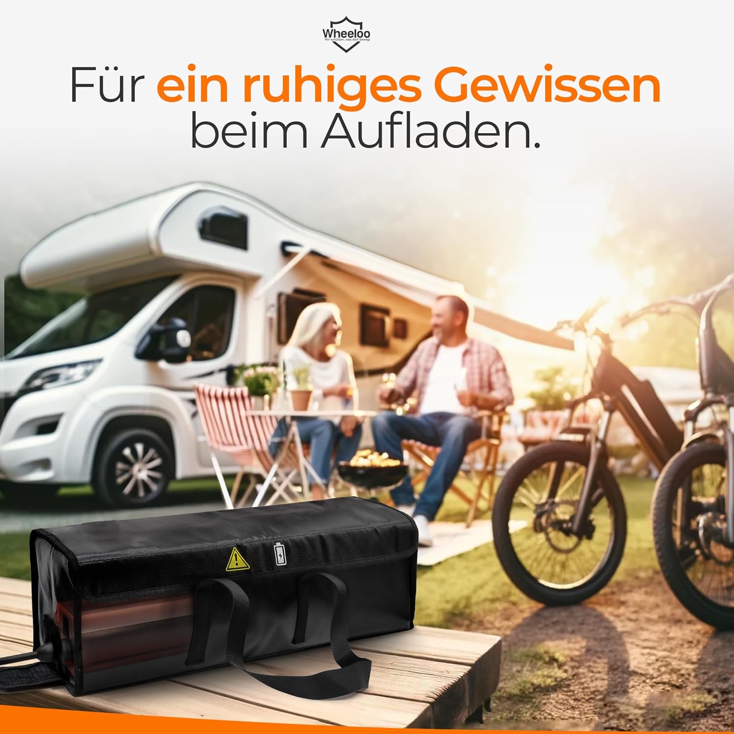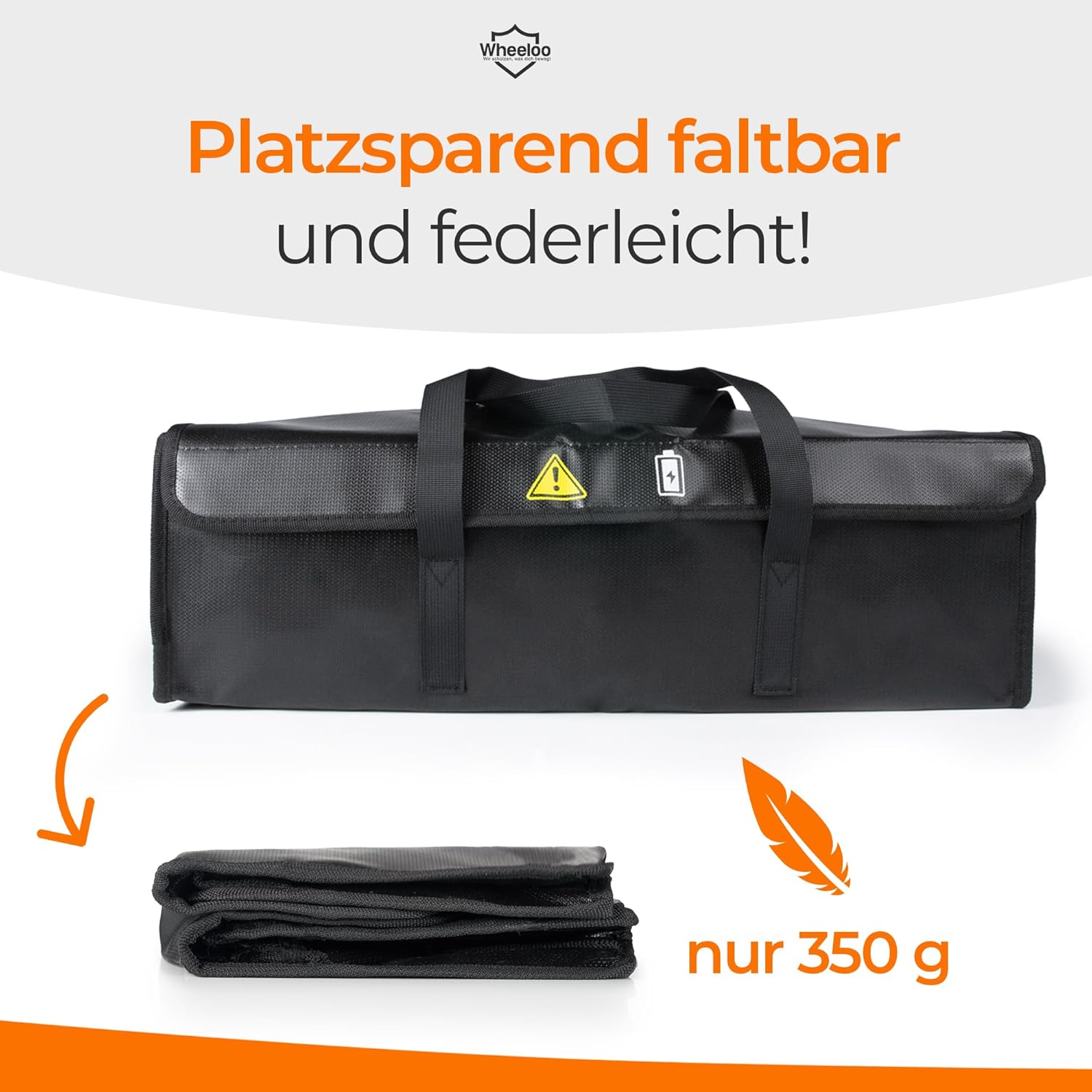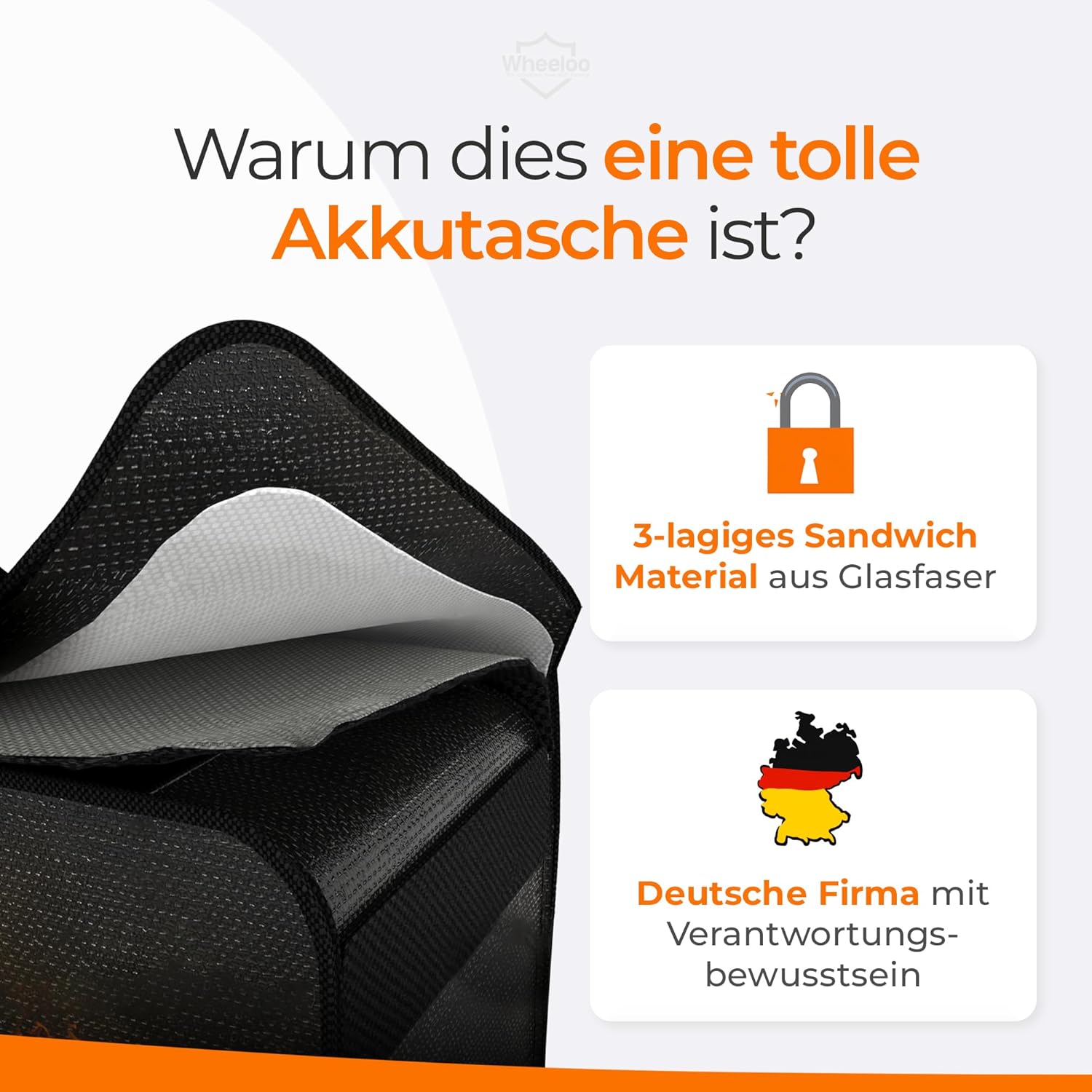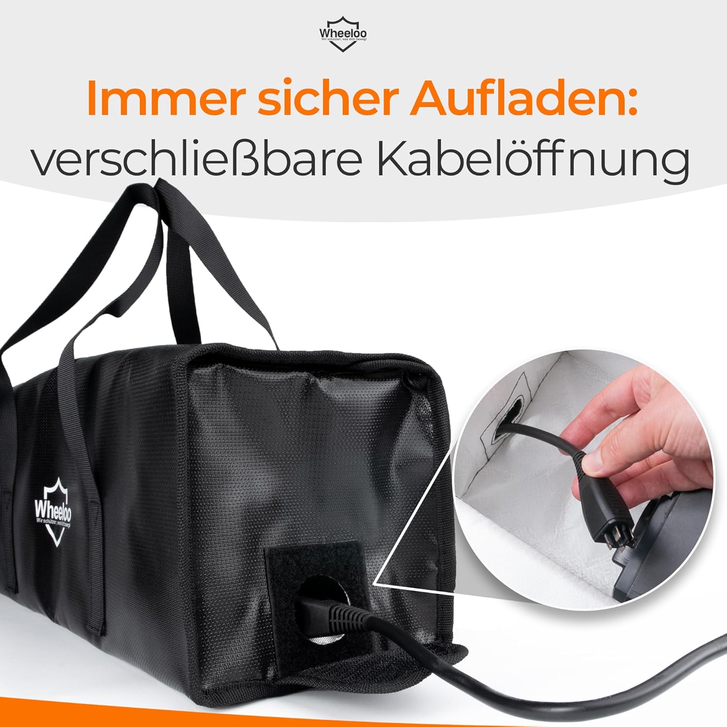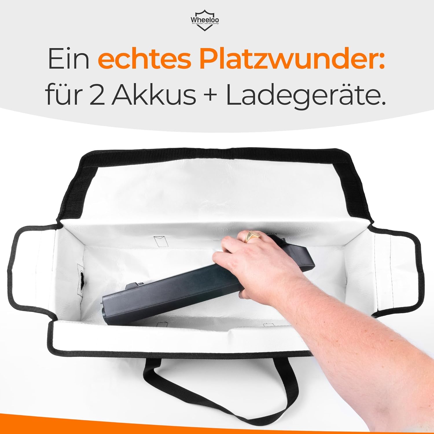 Top-Angebot: Wheeloo Battery Bag for E-Bike Bicycle Battery and Lipo Battery I Temperature Resistant up to 550 Degrees I including Velcro fastener, zip, cable guide for storage, transport, charging, case